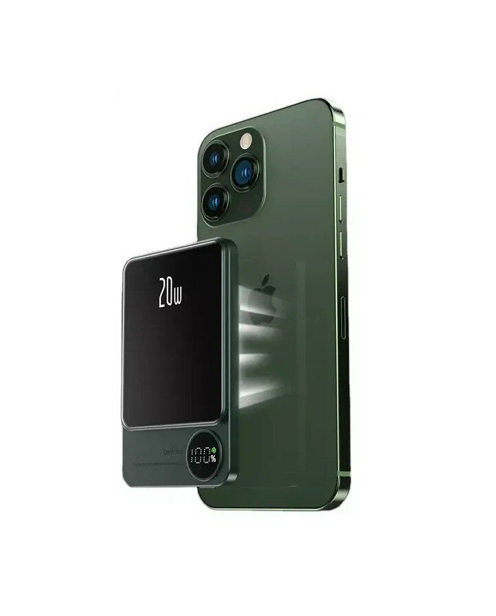 Беспроводной Power bank 10000 мАч 20 Ватт MagSafe для Apple iPhone / Магнитная быстрая зарядка на Эпл Айфон / Внешний аккумулятор / Повербанк / Зеленый