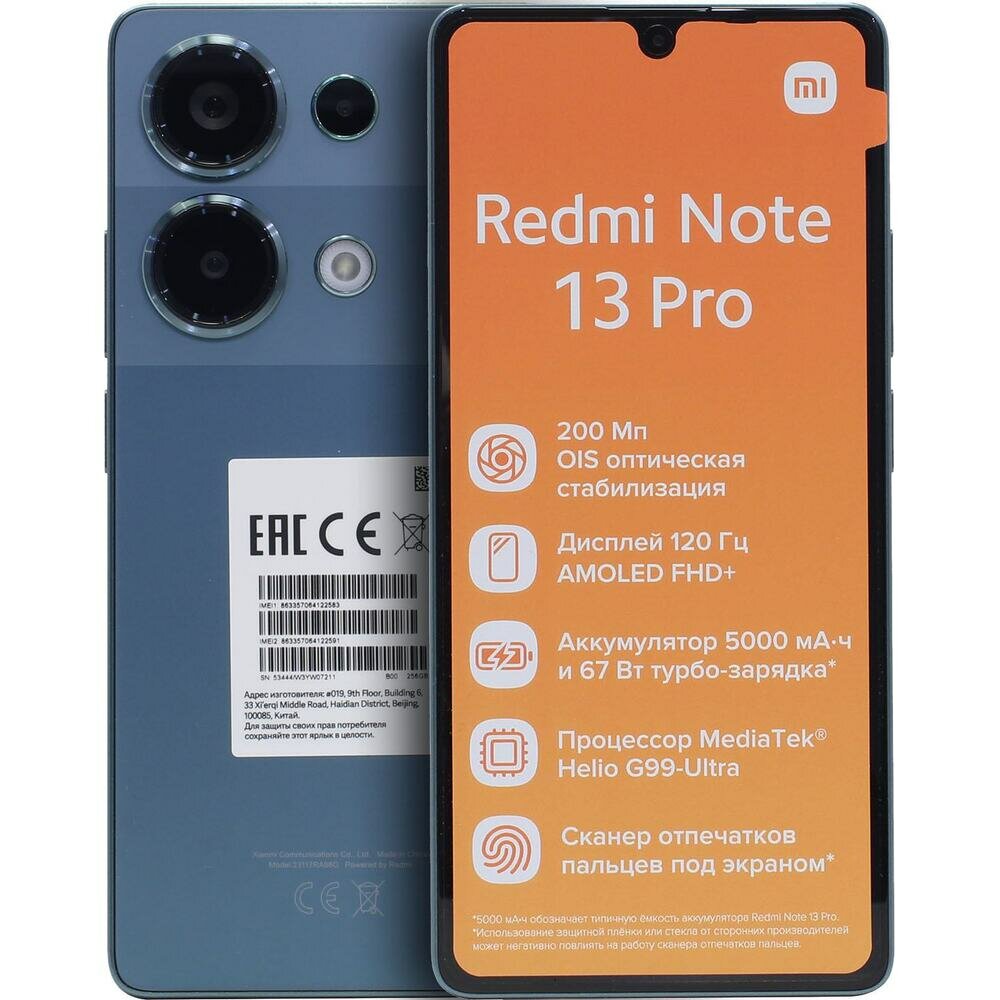 Смартфон Xiaomi Redmi Note 13 Pro 8+256 N6/Forest Green 6.67 FHD+/AMOLED/120 Hz/MTK G99 Ultra/And13/200+8+2/16MP/NFC/5000mAh