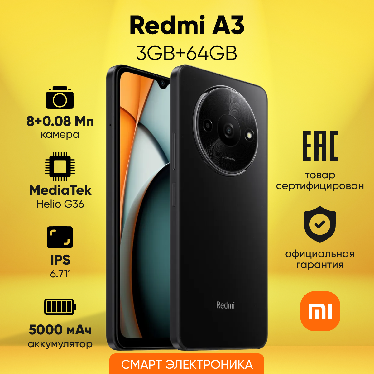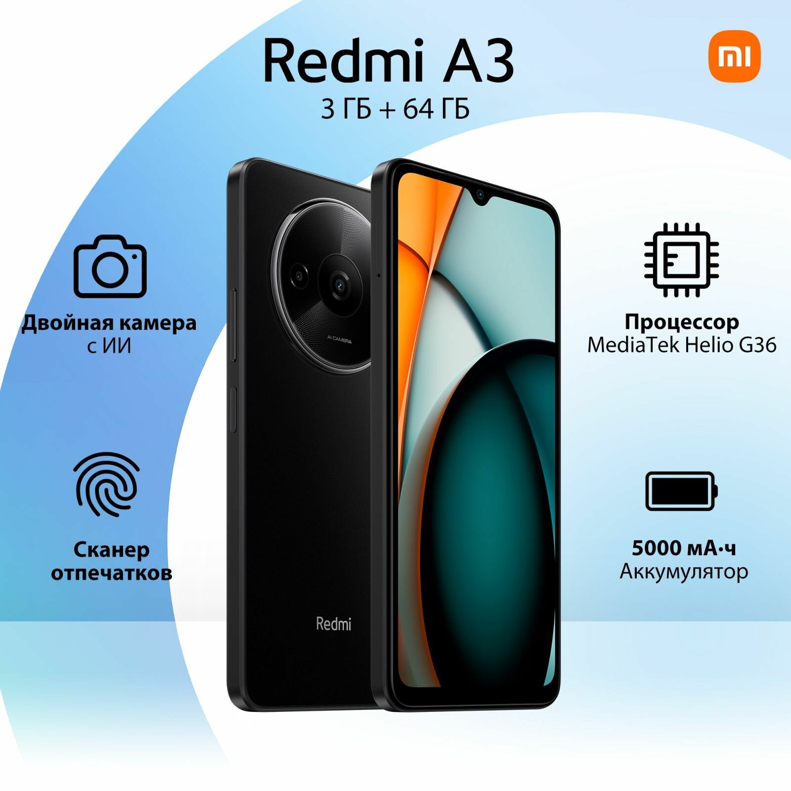 Смартфон Xiaomi Redmi A3 3/64 ГБ RU, Dual nano SIM, midnight black