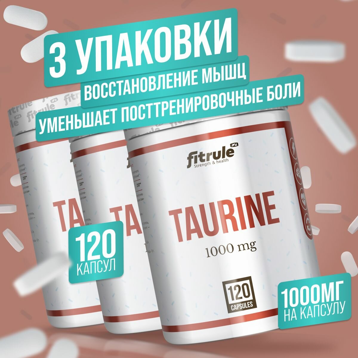 Аминокислота FitRule Taurine, без вкуса, 1000мг, 3 банки, 120 капсул