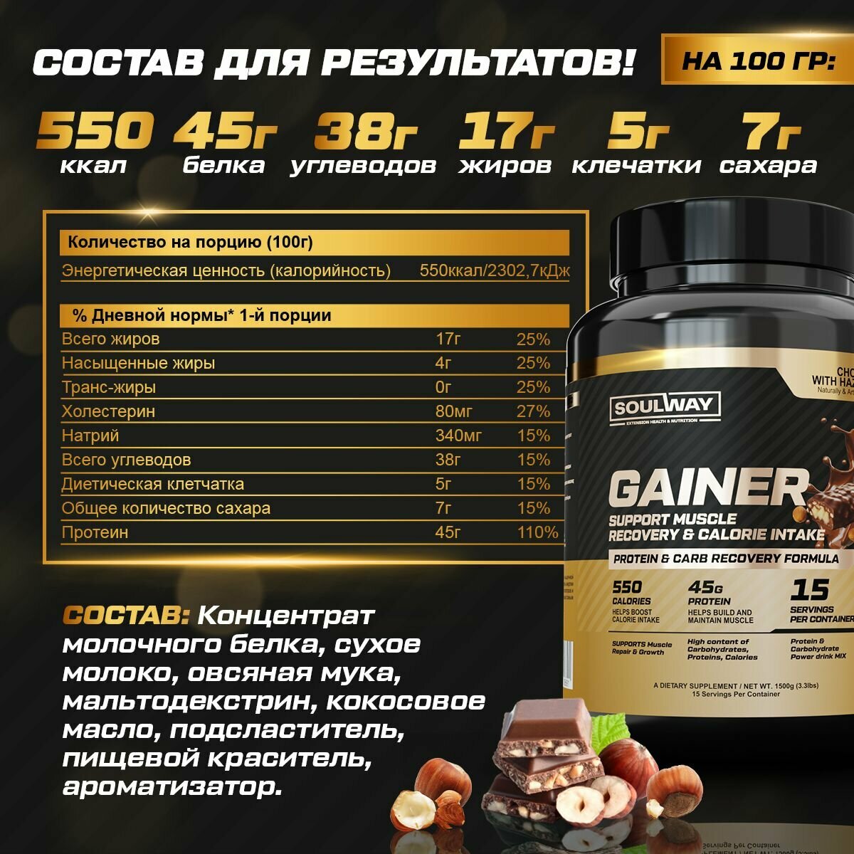 3 банки Гейнер высокобелковый / шоколад с лесным орехом / 4500 гр 45 порций интересное: