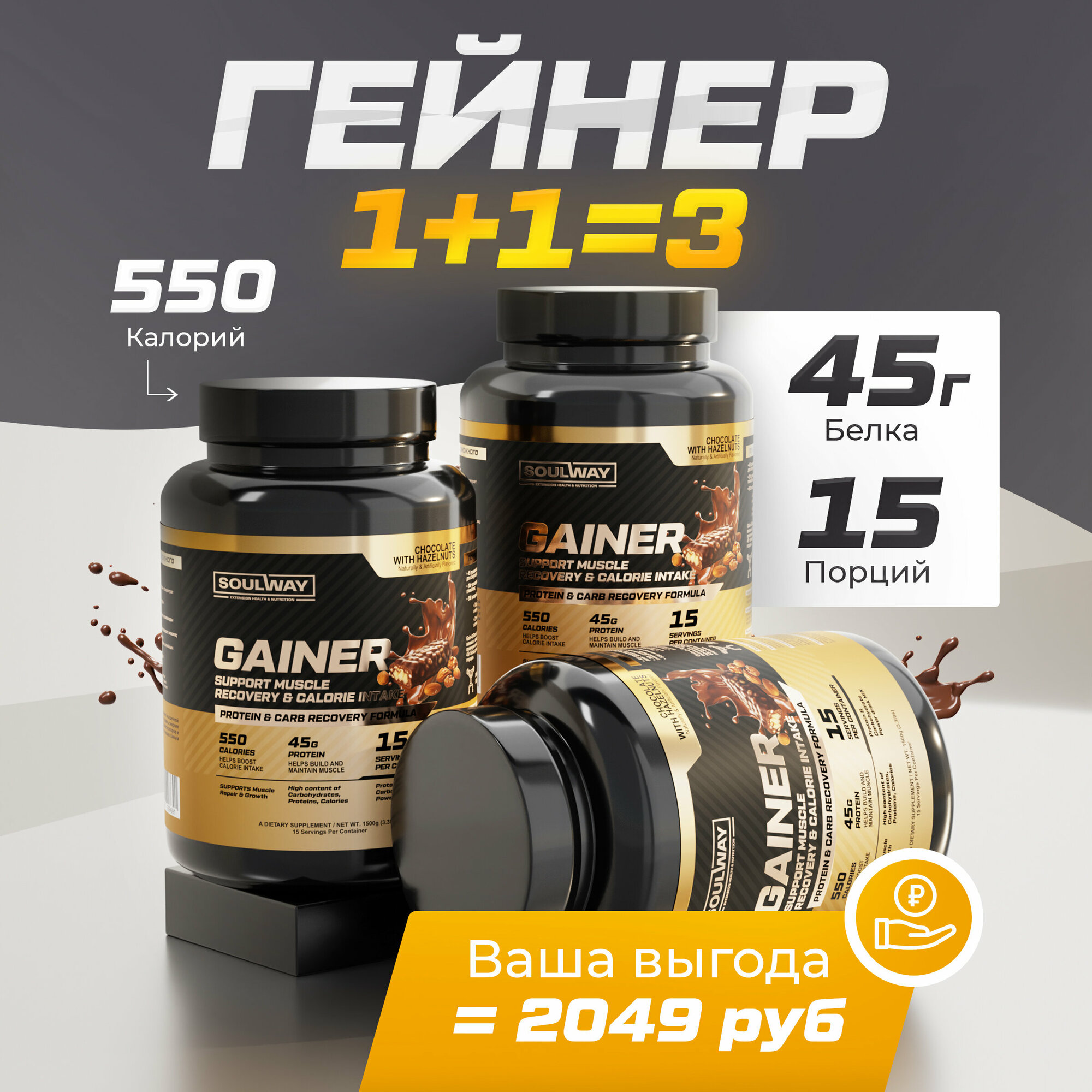 Купить 3 банки Гейнер высокобелковый / шоколад с лесным орехом / 4500 гр 45 порций
