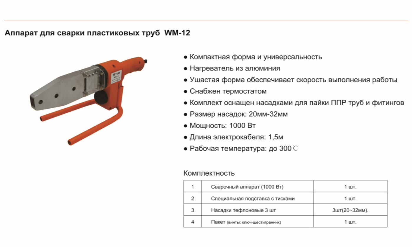 Ниже Вы можете прочитать отзывы на Паяльник для ППР труб и фитингов / 20-32 мм / 800 Вт TIM арт. WM-12, ознакомится с подробными характеристиками, посмотреть интересные обзоры и фотографии на Паяльник для ППР труб и фитингов / 20-32 мм / 800 Вт TIM арт. WM-12.
