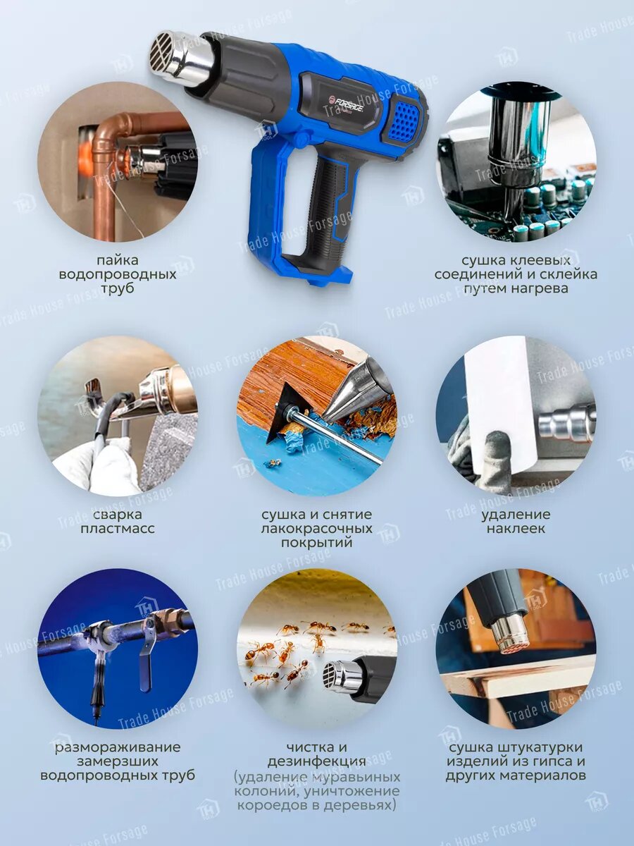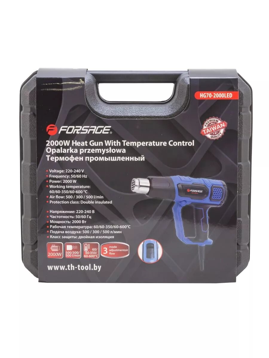 Фен промышленный электрический с насадками (220В,50/60Гц,2000Вт, 60/350/600C, 50/300/500л/мин,3 режима,класс защиты-двойная изоляция)в кейсе Forsage F-HG70-2000LED