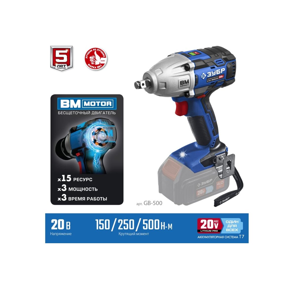 ЗУБР Т7, 20 В, 500 Н·м, без АКБ, бесщеточный гайковерт, Профессионал (GB-500)