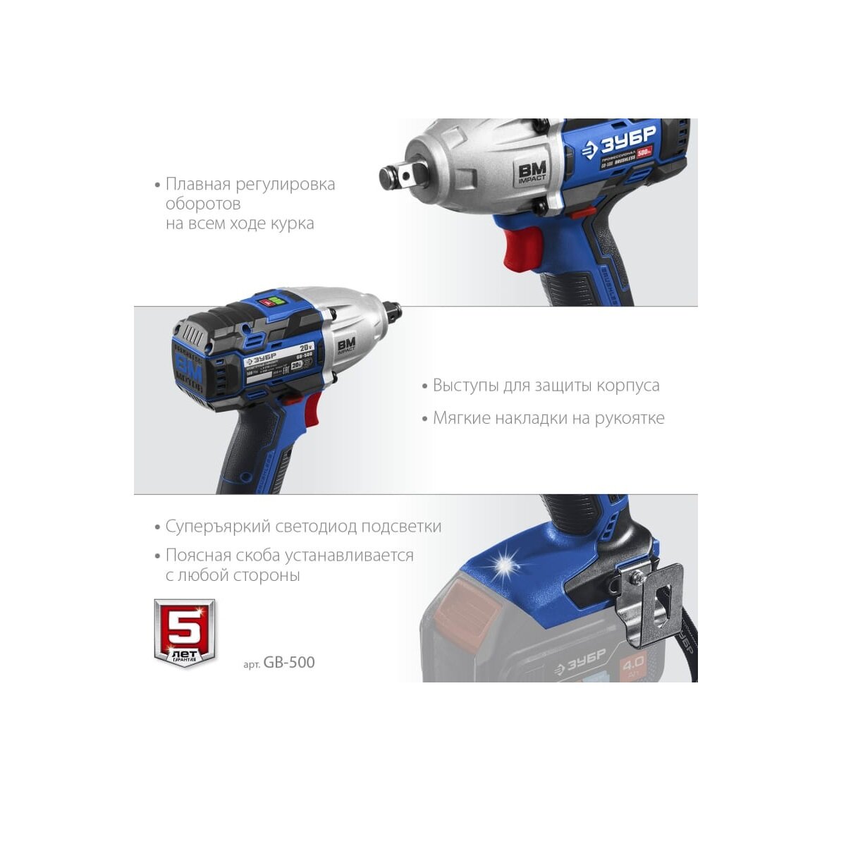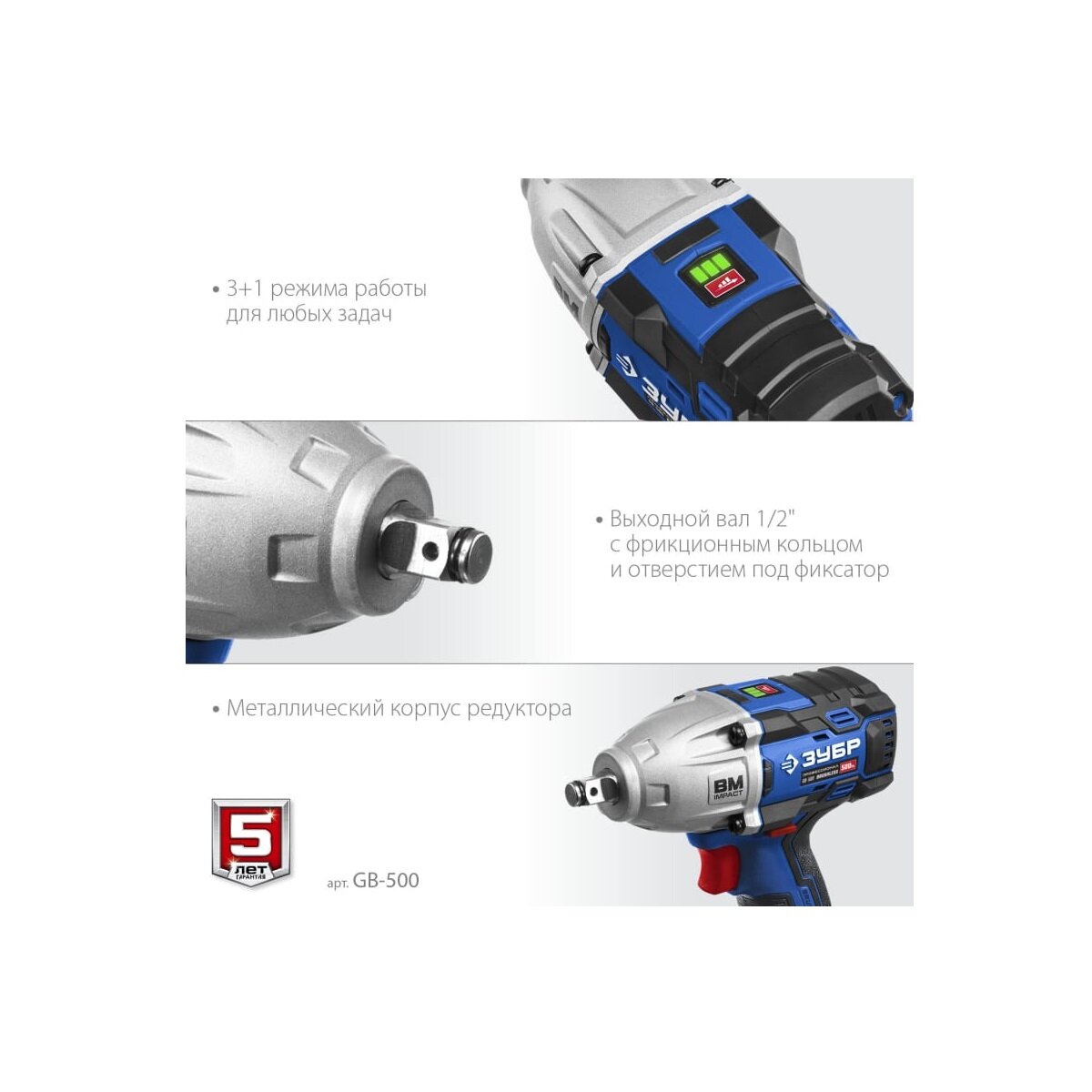 ЗУБР 20В, без АКБ, в коробке, бесщеточный, аккумуляторный гайковерт GB-500 Профессионал интересное: