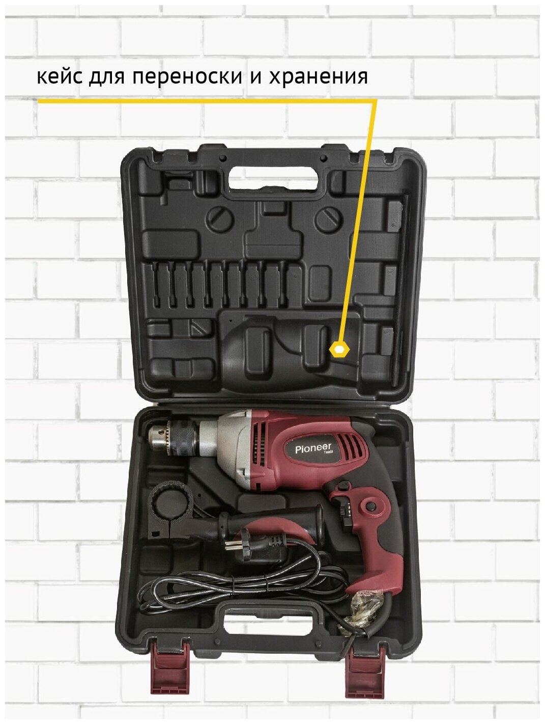 Электродрель ударная Pioneer EID-M1100-01C с щеточным двигателем, 2 режима работы, реверс, ключевой патрон, рукоятка Anti-Slip+дополнительная рукоятка, 1100 Вт