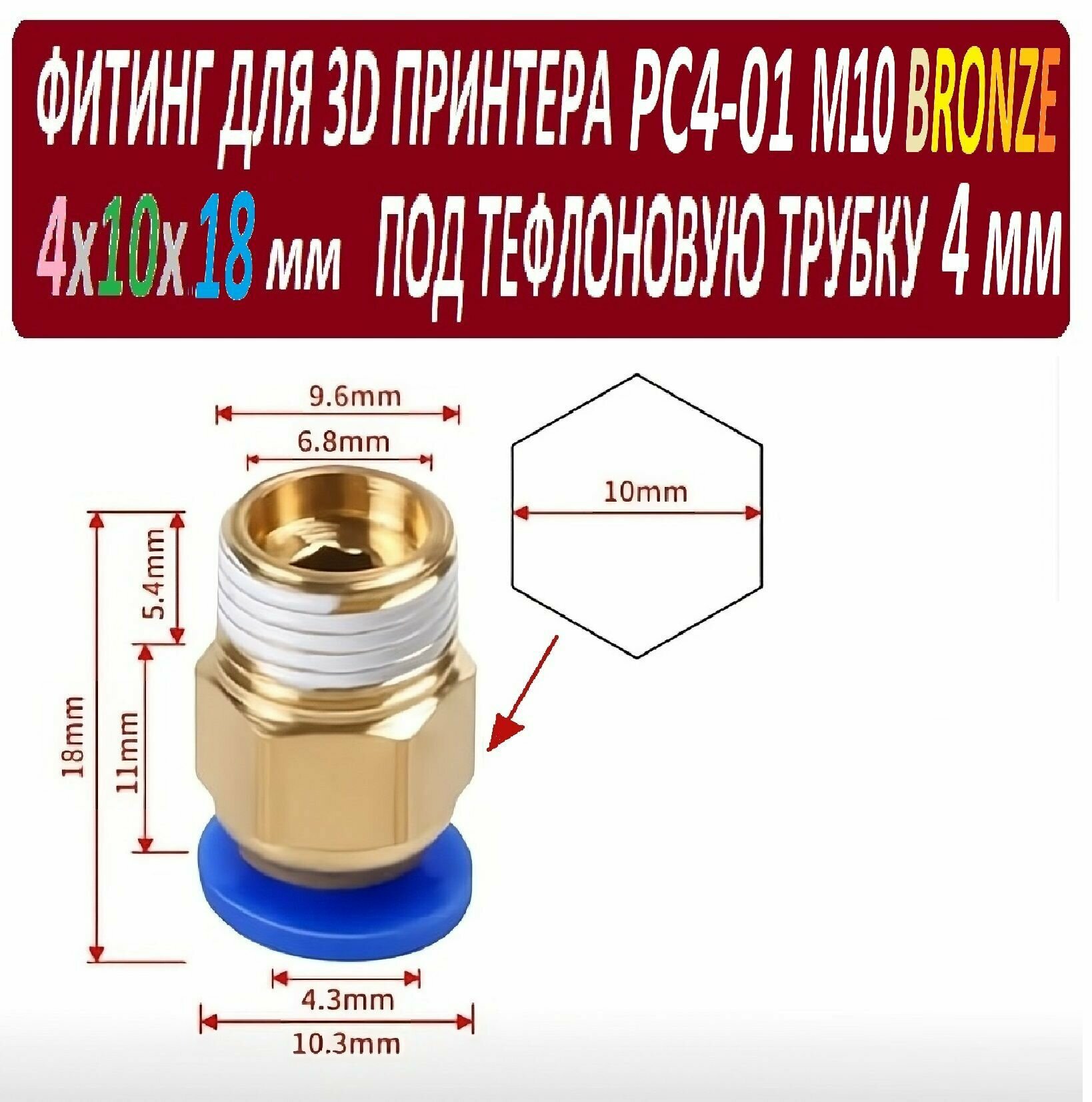 Купить Фитинг PC4-01 M10 Bronze для 3D принтера под тефлоновую трубку 2х4 мм - 1 штука