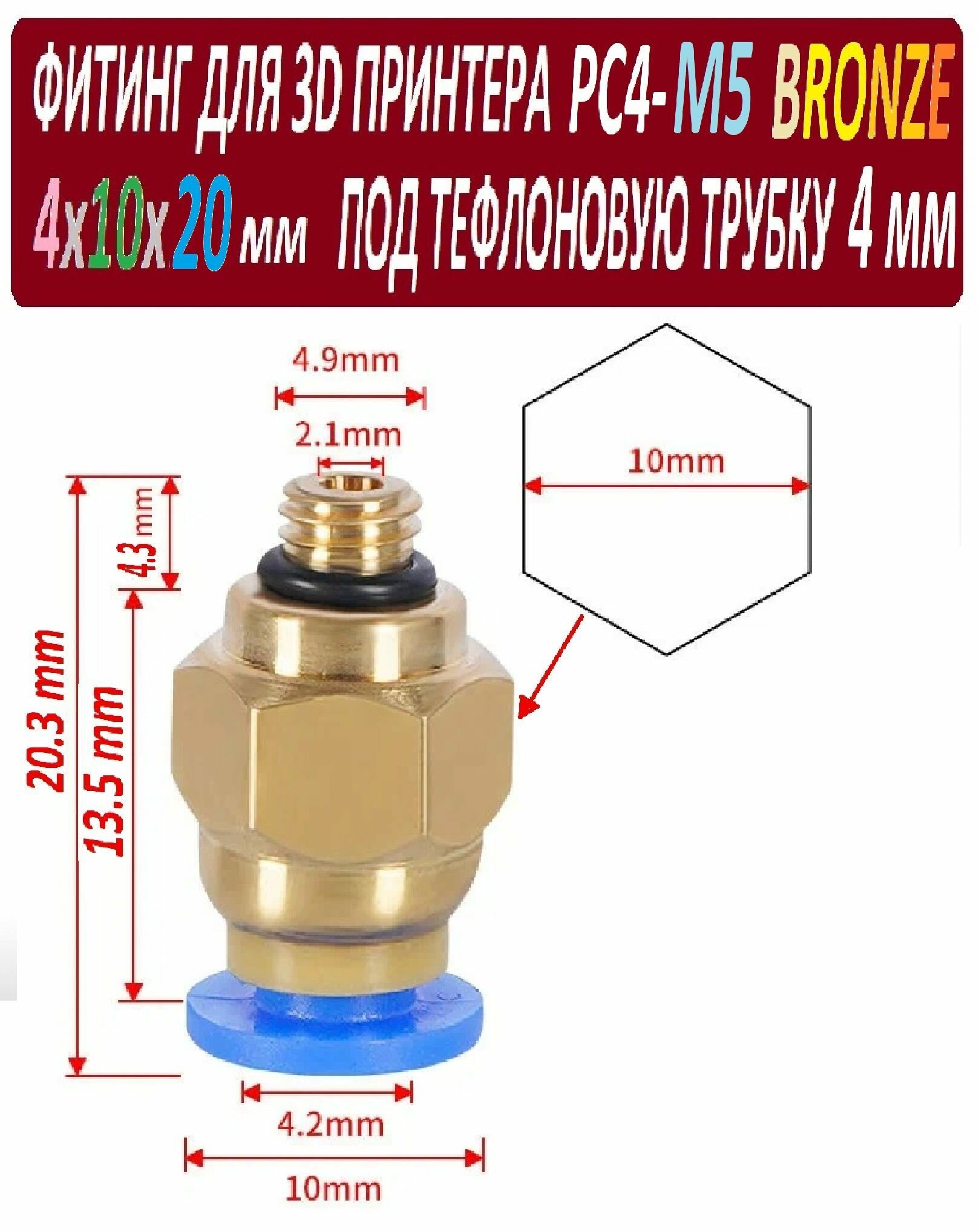 Купить Фитинг PC4-M5 Bronze для 3D принтера под тефлоновую трубку 2х4 мм - 1 штука
