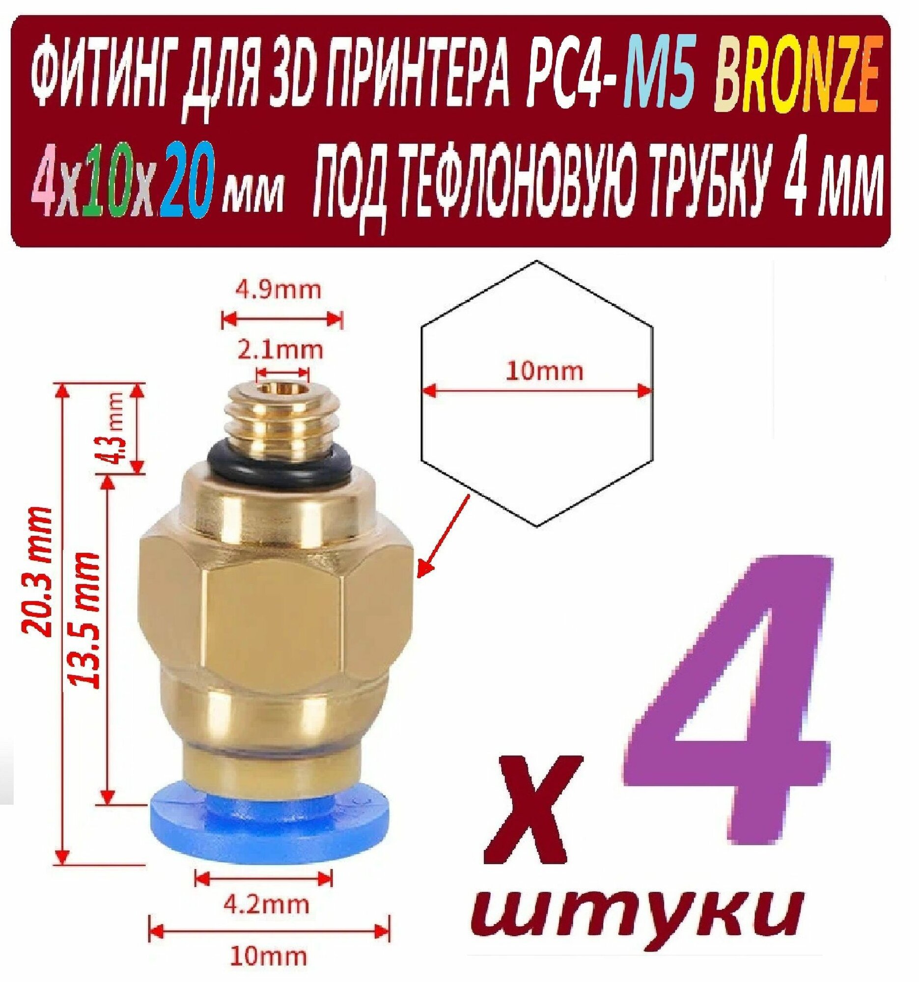 Купить Фитинги PC4-M5 Bronze для 3D принтера под тефлоновую трубку 2х4 мм - 4 штуки
