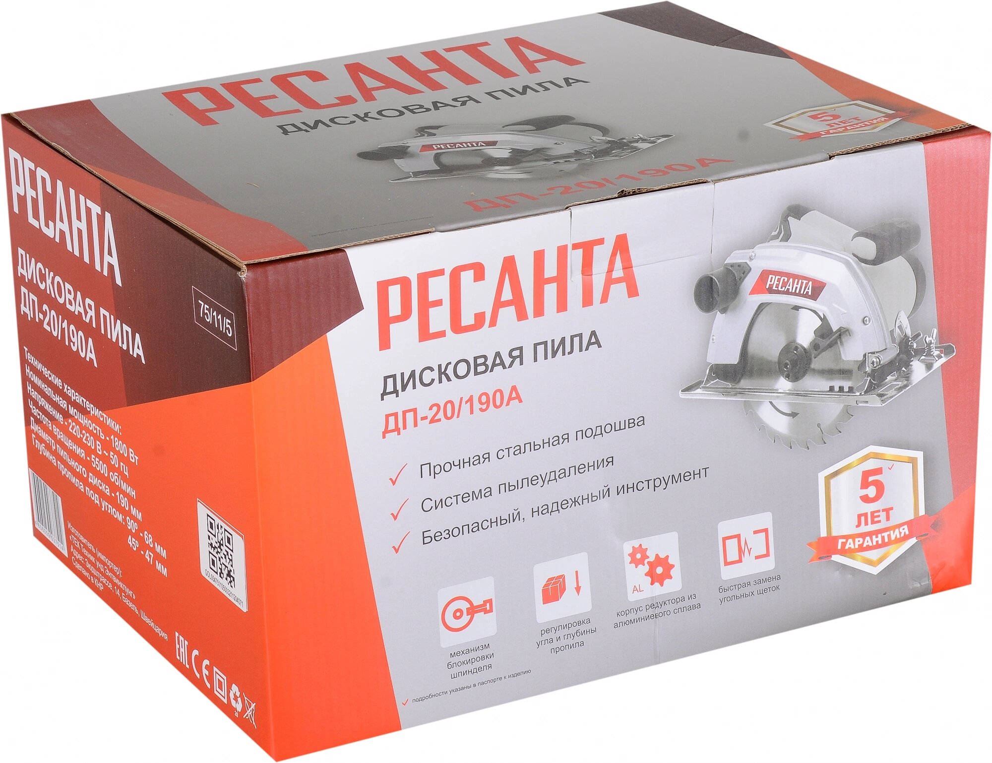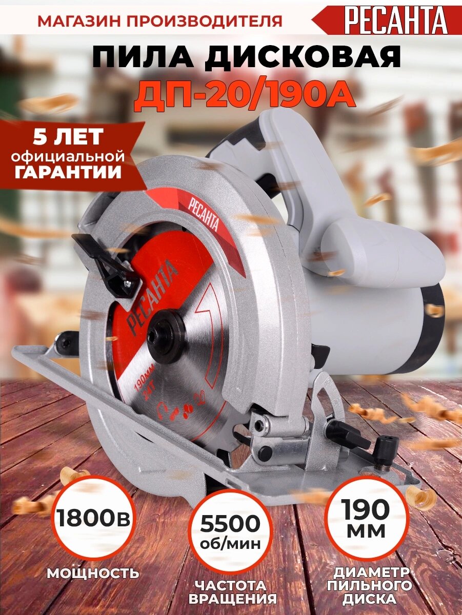Дисковая пила циркулярная ДП-20/190А Ресанта - 1800Вт, диск 190мм, пропил до 68мм, гарантия 5 ЛЕТ