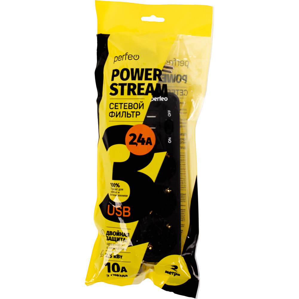 Купить Сетевой фильтр Perfeo "POWER STREAM", 2500W, двойная защита, 2м, 3 розетки, 3 USB, черный.