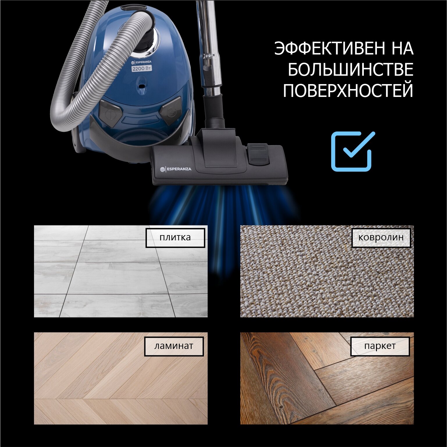 Мощный пылесос бытовой тихий для дома с мешком 1,5 л 250 Вт/2200 Вт ESPERANZA VC-B101, синий