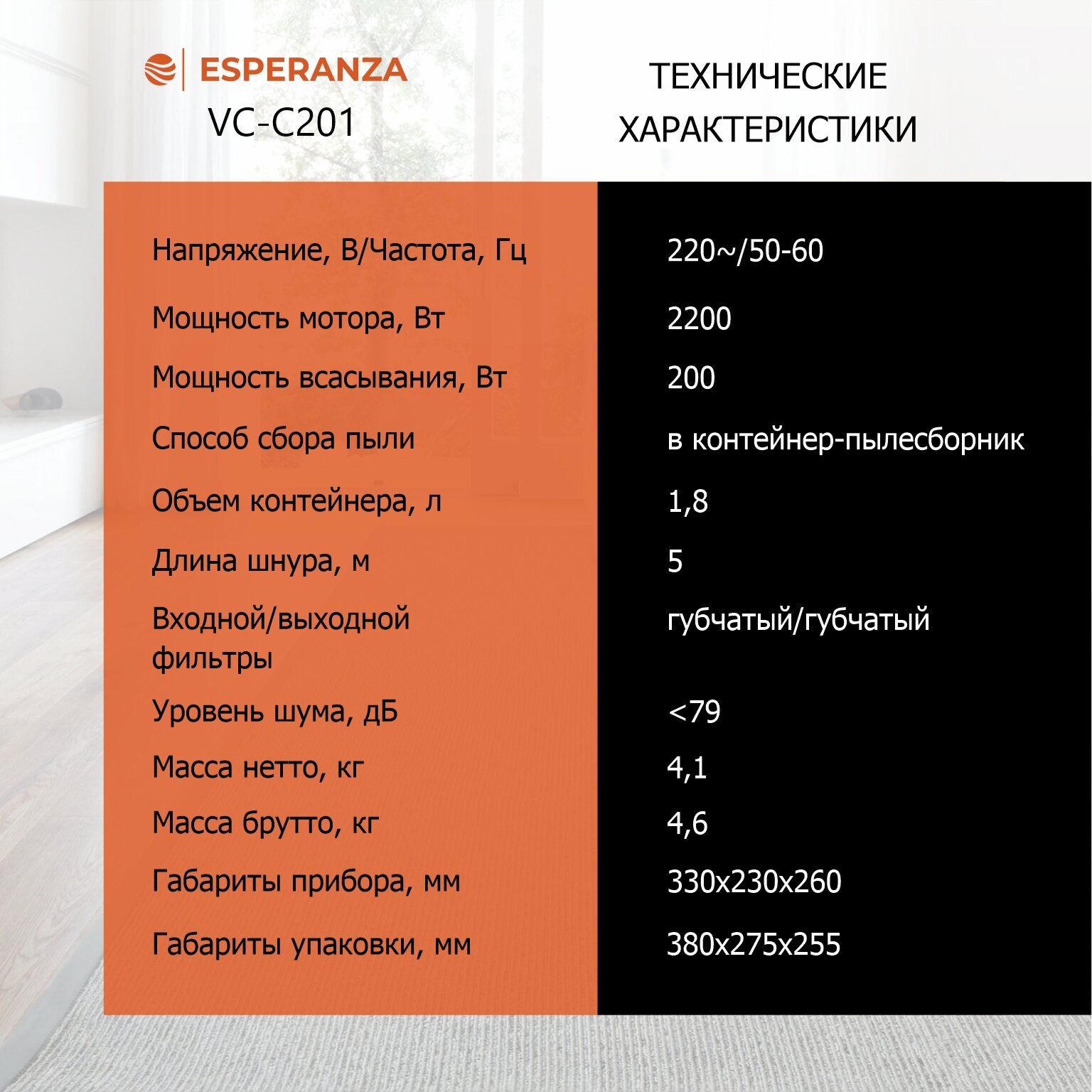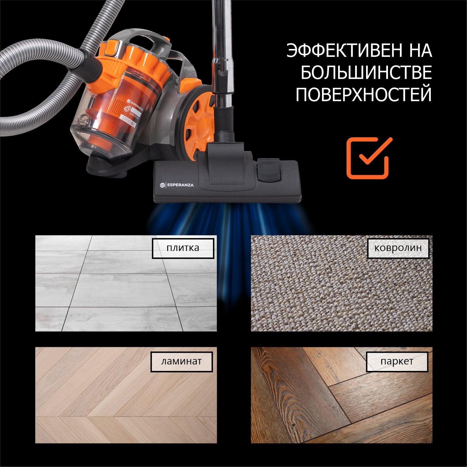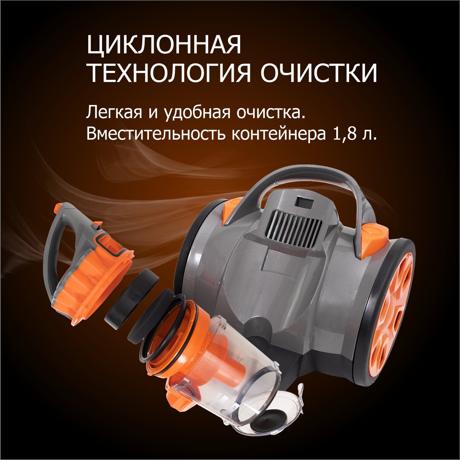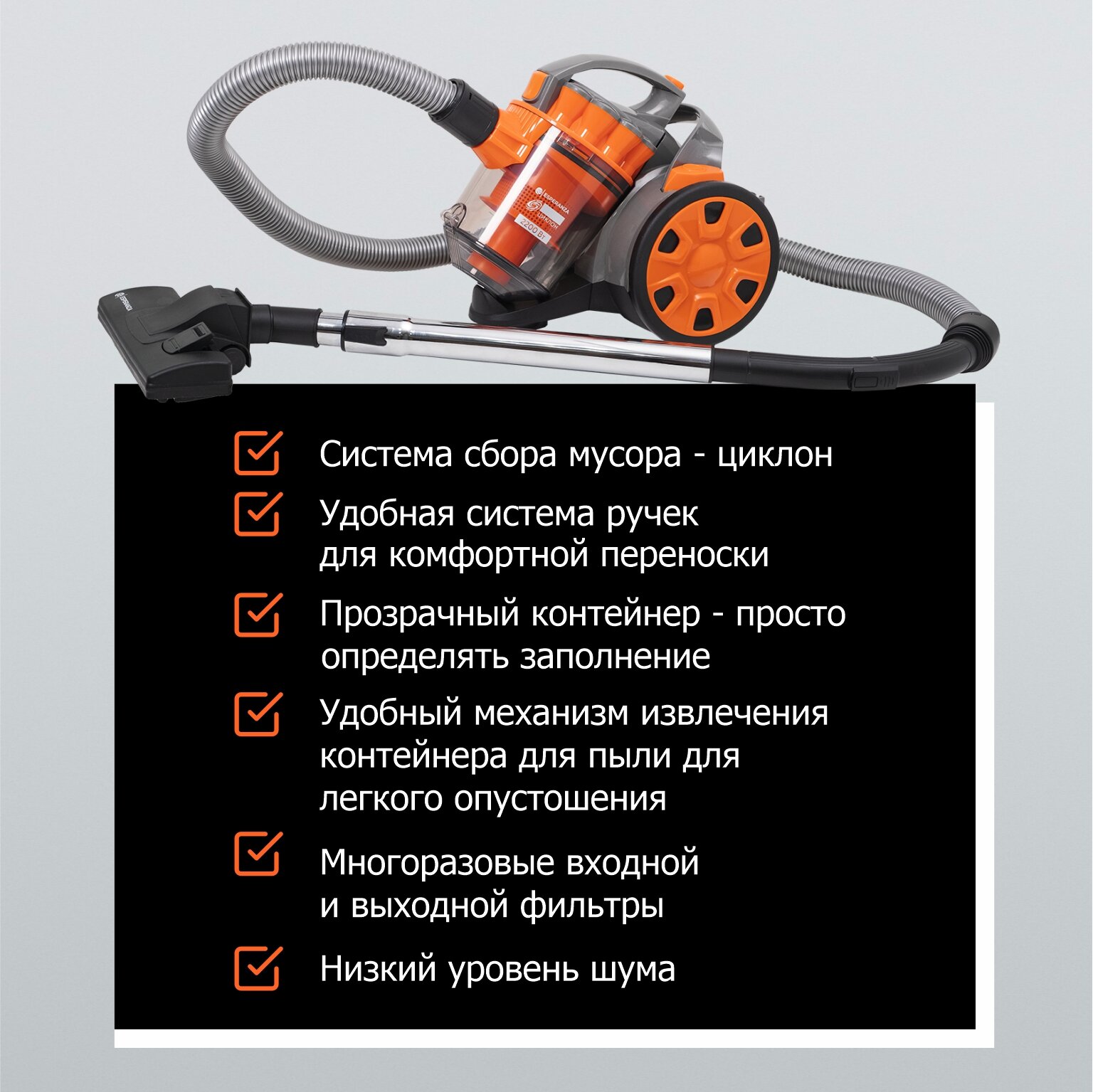 Пылесос для дома мощный циклонный с контейнером 1,8 л мощностью 250 Вт/2200 Вт ESPERANZA VC-С201, оранжевый