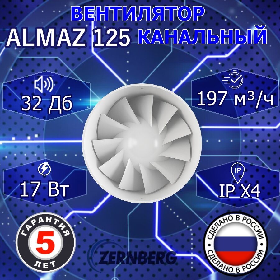 Вентилятор канальный Almaz 125 ZERNBERG, бесшумный, двигатель на шарикоподшипниках