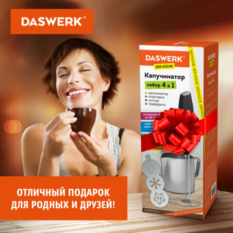 Капучинатор DASWERK вспениватель электрический с подставкой, питчером, трафаретами 4 в 1, черный