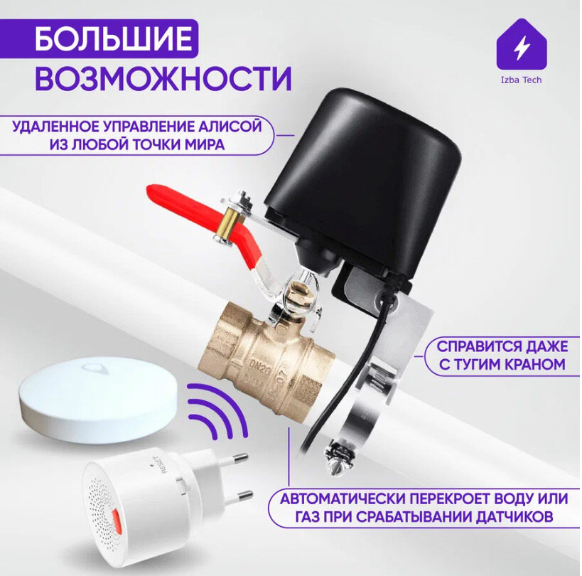 Электропривод крана.Актуатор.Zigbee(нужен хаб) или Яндекс станция с zigbee. С Алисой интересное: