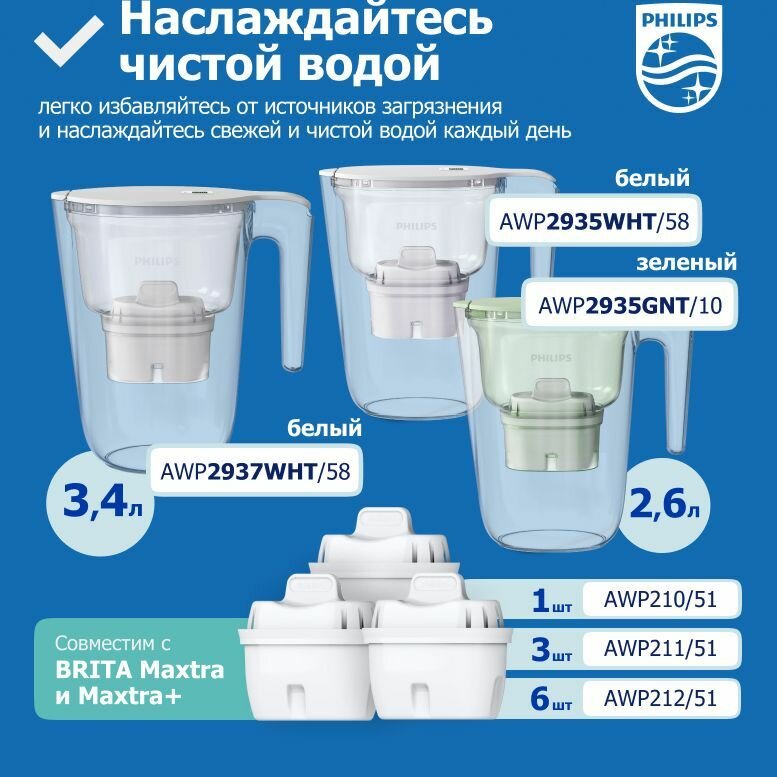 Комплект кувшин Philips AWP2936BLT с картриджем внутри, 3 л, цифровой таймер + сменный универсальный картридж Philips AWP210 (1 шт), задерживает хлор, известь, тяжелые металлы, микропластики и пфок