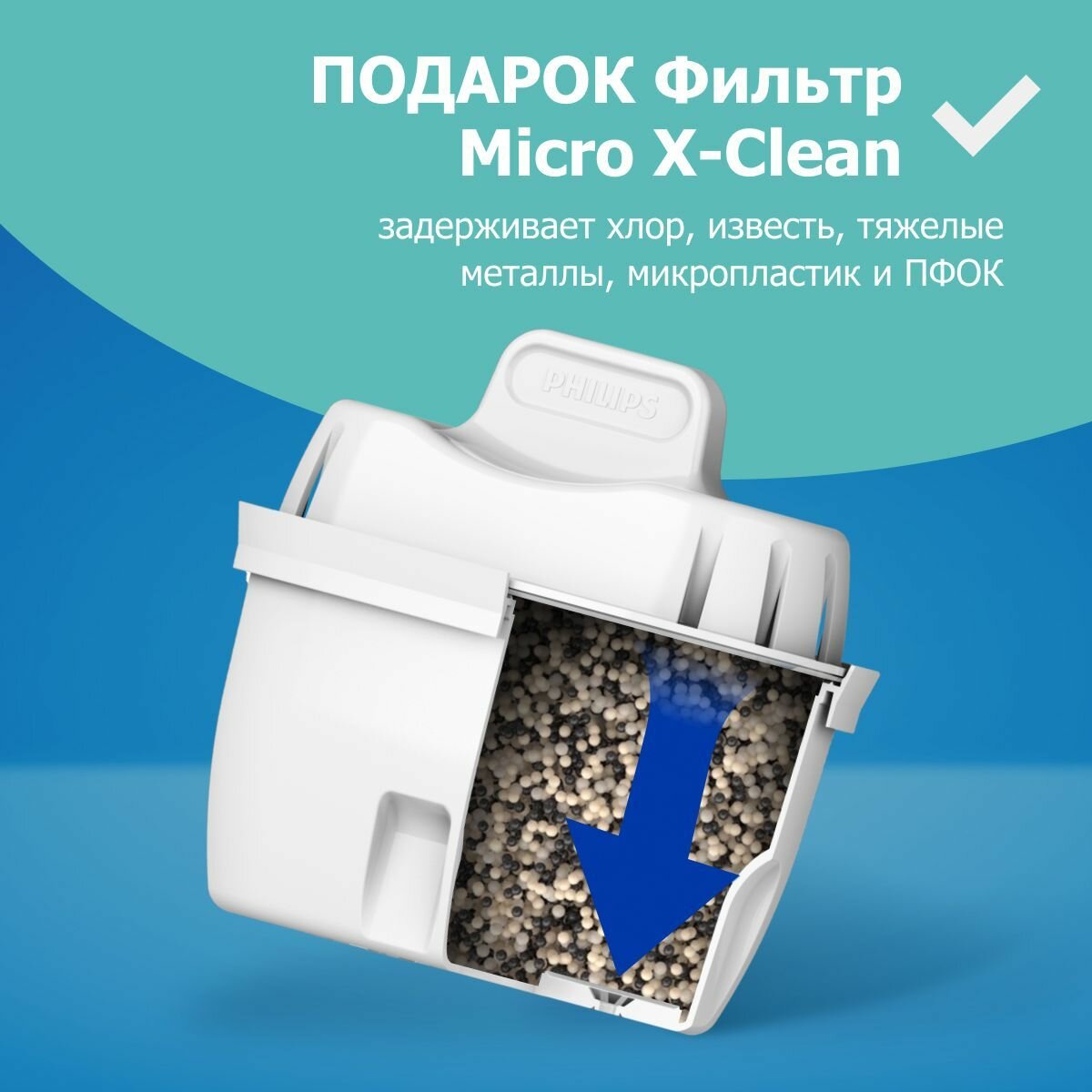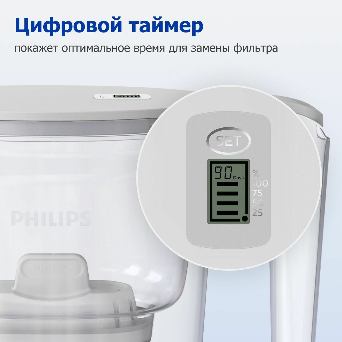 Комплект кувшин Philips AWP2936BLT с картриджем внутри, 3 л, цифровой таймер + сменный универсальный картридж Philips AWP210 (1 шт), задерживает хлор, известь, тяжелые металлы, микропластики и пфок