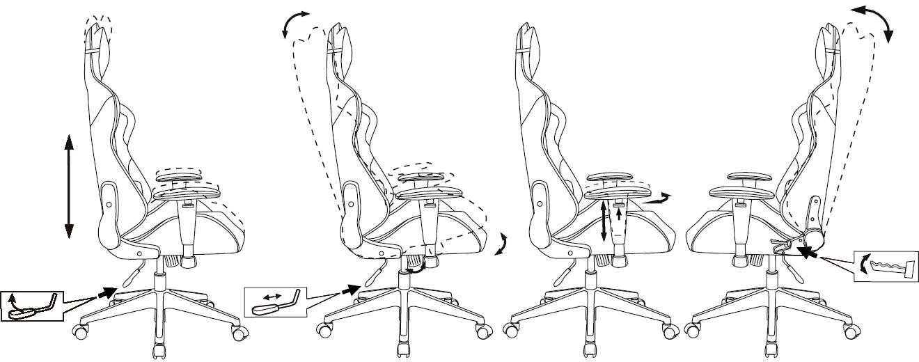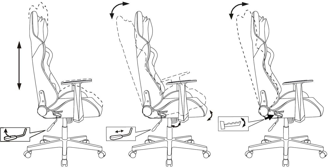 | Регулировка | высоты подлокотников / высоты поясничного упора / высоты сиденья / жесткости качания / наклона спинки / угла подлокотников |