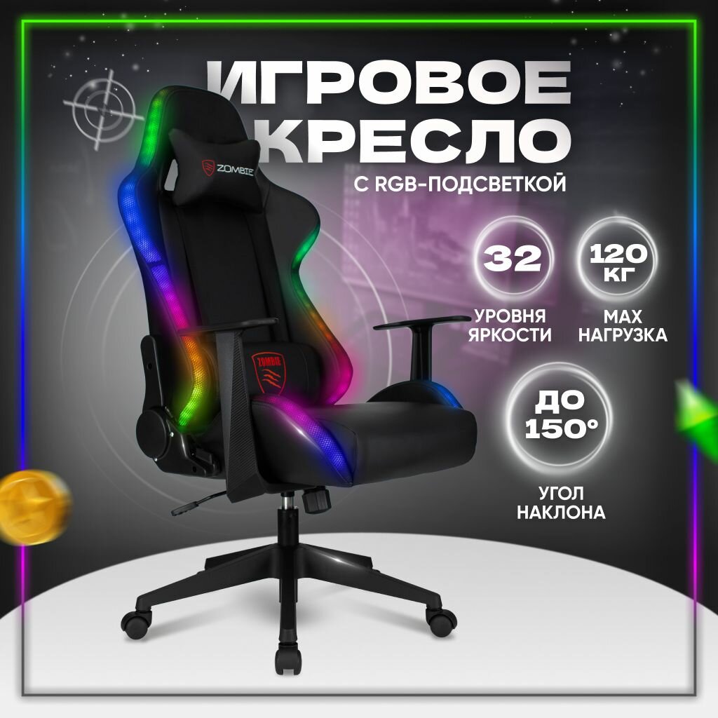 СохранитьКресло компьютерное игровое Zombie, экокожа, ткань, черное, с RGB подсветкой, крестовина пластик - Кресло геймерское, с подголовником интересное: