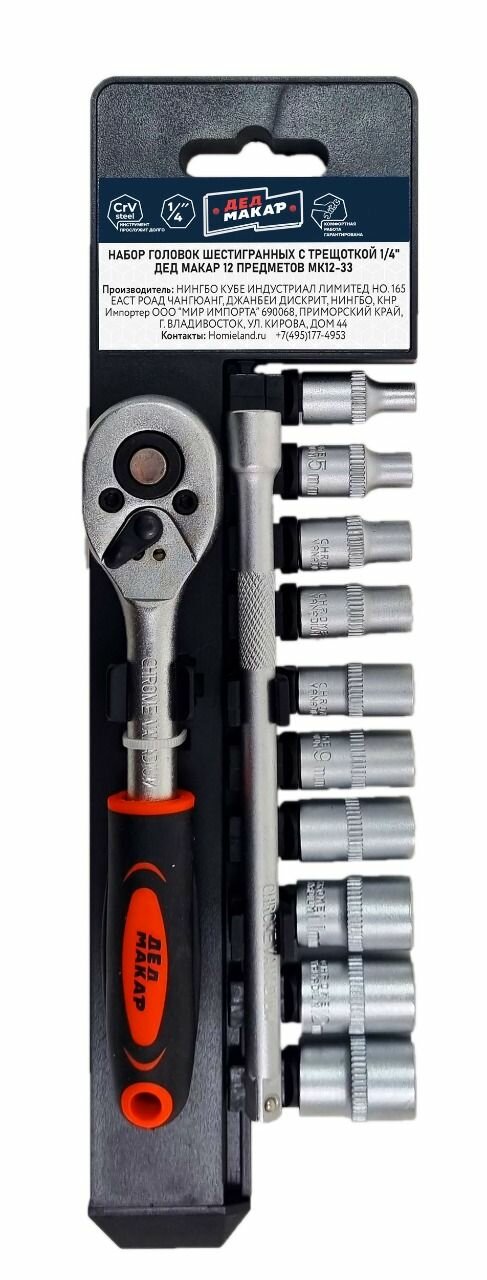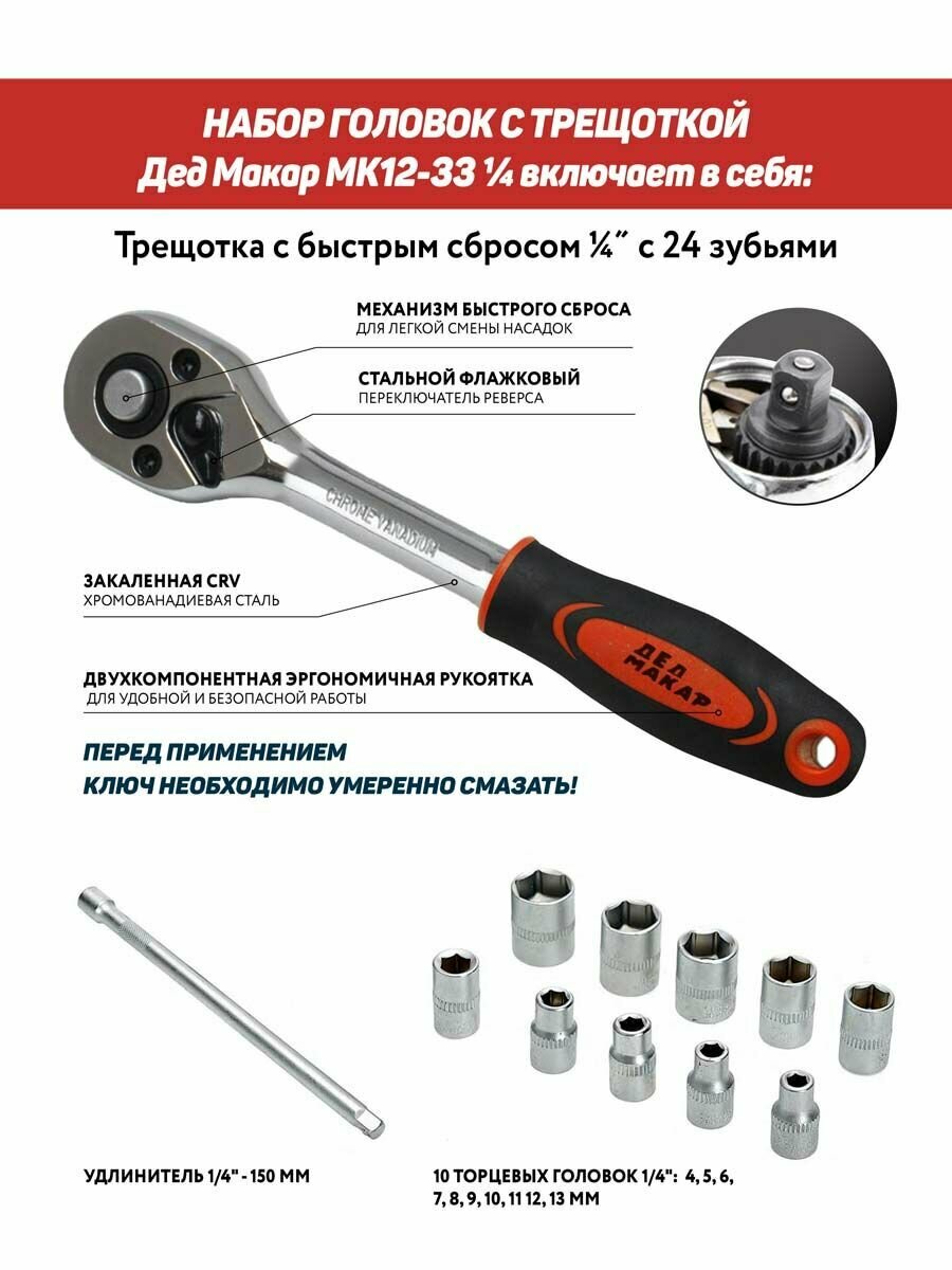 Дед Макар Набор головок торцевых МК12-33 с трещоткой 1/4, 12 предметов 00-00015835