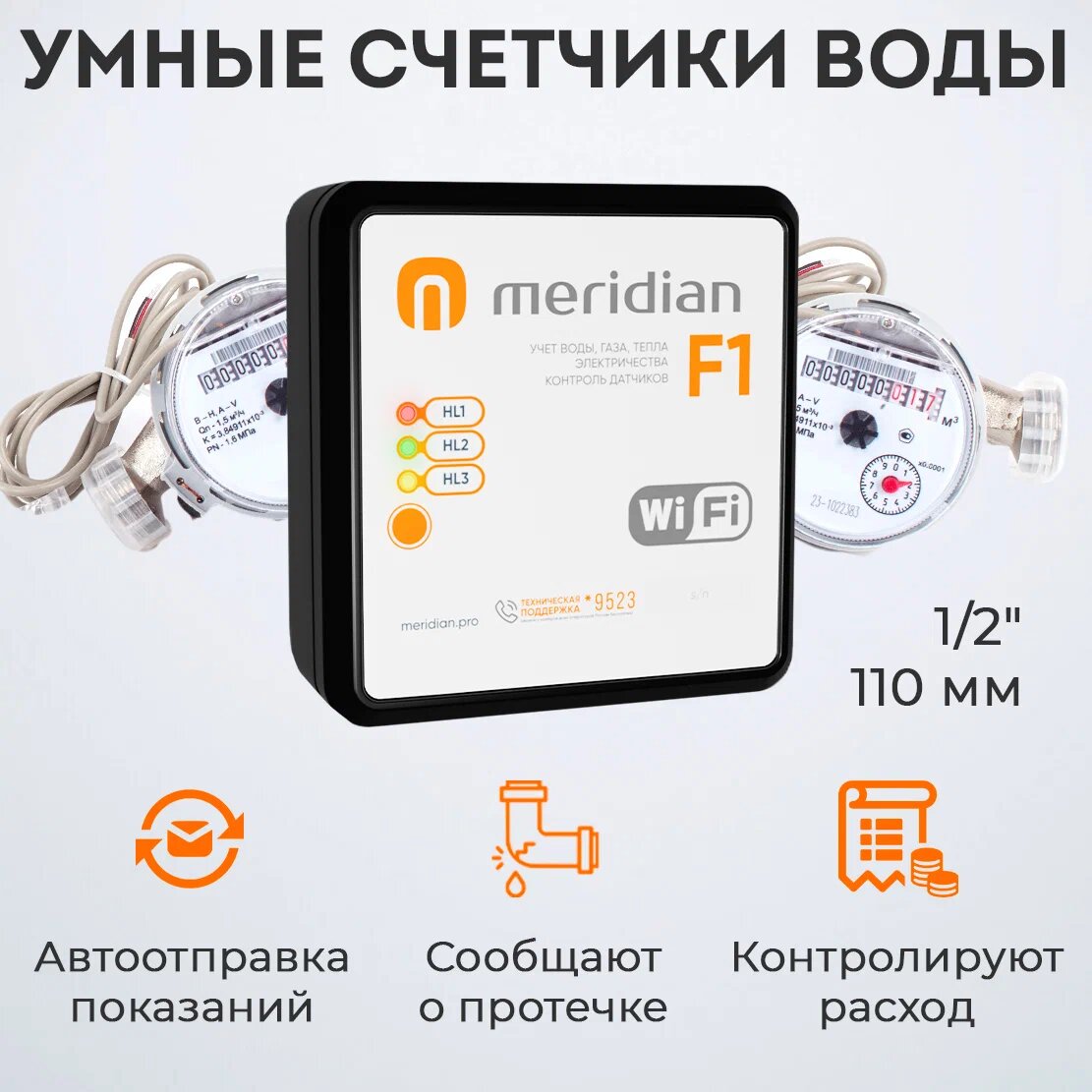 Набор Умные счетчики Meridian для передачи показаний по Wi-Fi (смарт устройство + 2 импульсных счетчика воды 1/2" 110 мм) интересное: