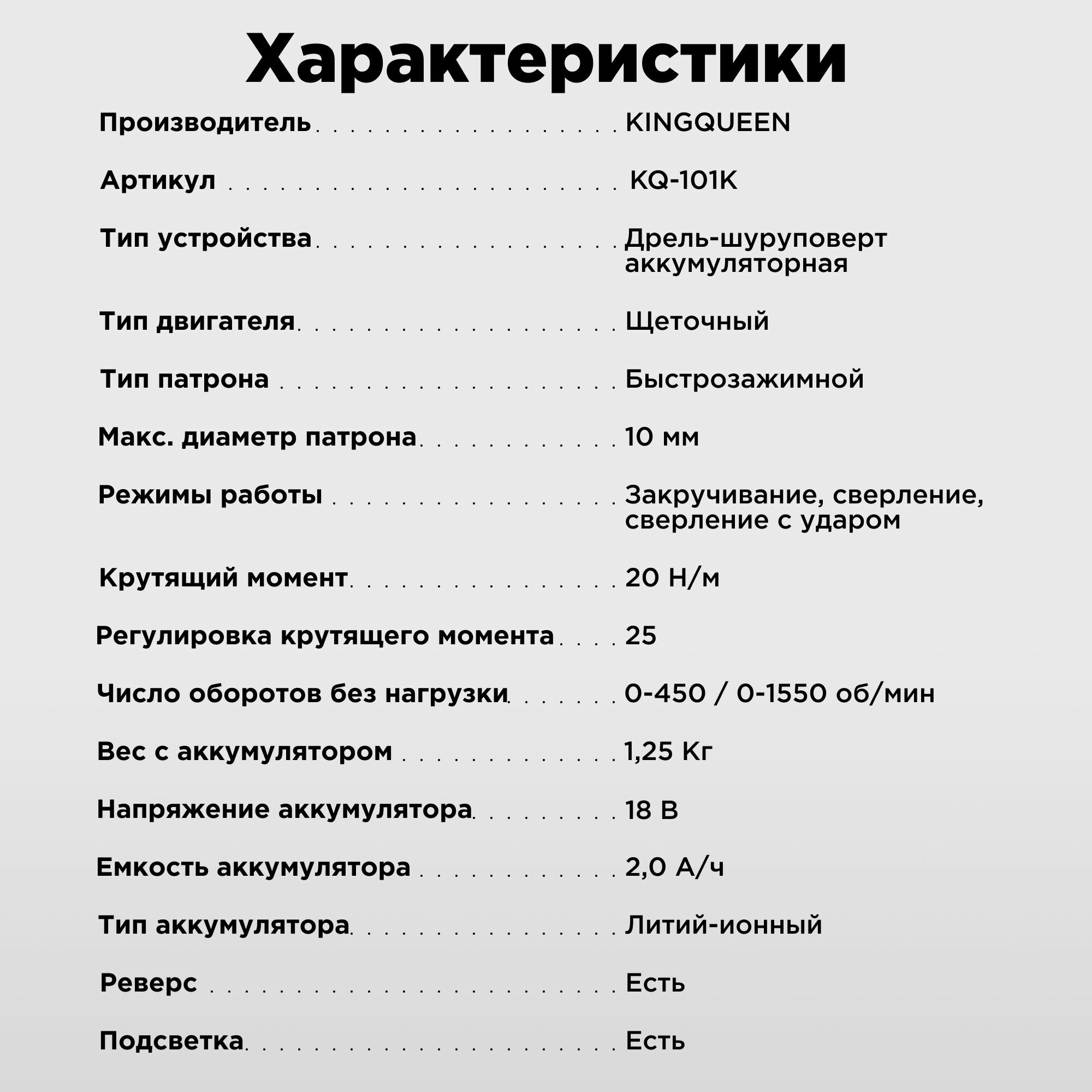 Шуруповерт аккумуляторный ударный, дрель аккумуляторная 18В, 20 Н/м, KINGQUEEN интересное: