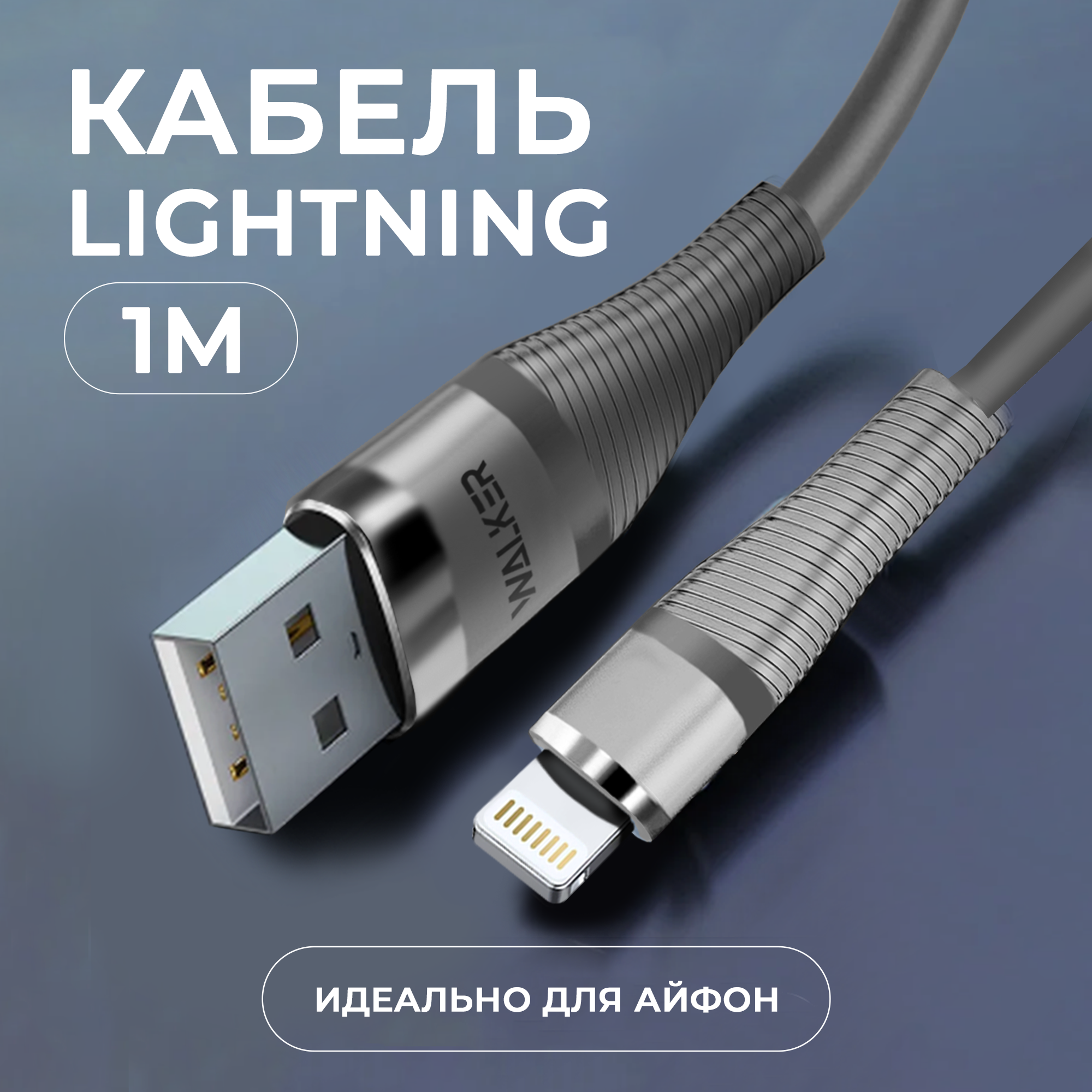Купить Провод для айфона, WALKER C735, С быстрым зарядом 3.1 А в силиконовой оплетке, разъём Lightning, серый, 1 метр, кабель для айфона