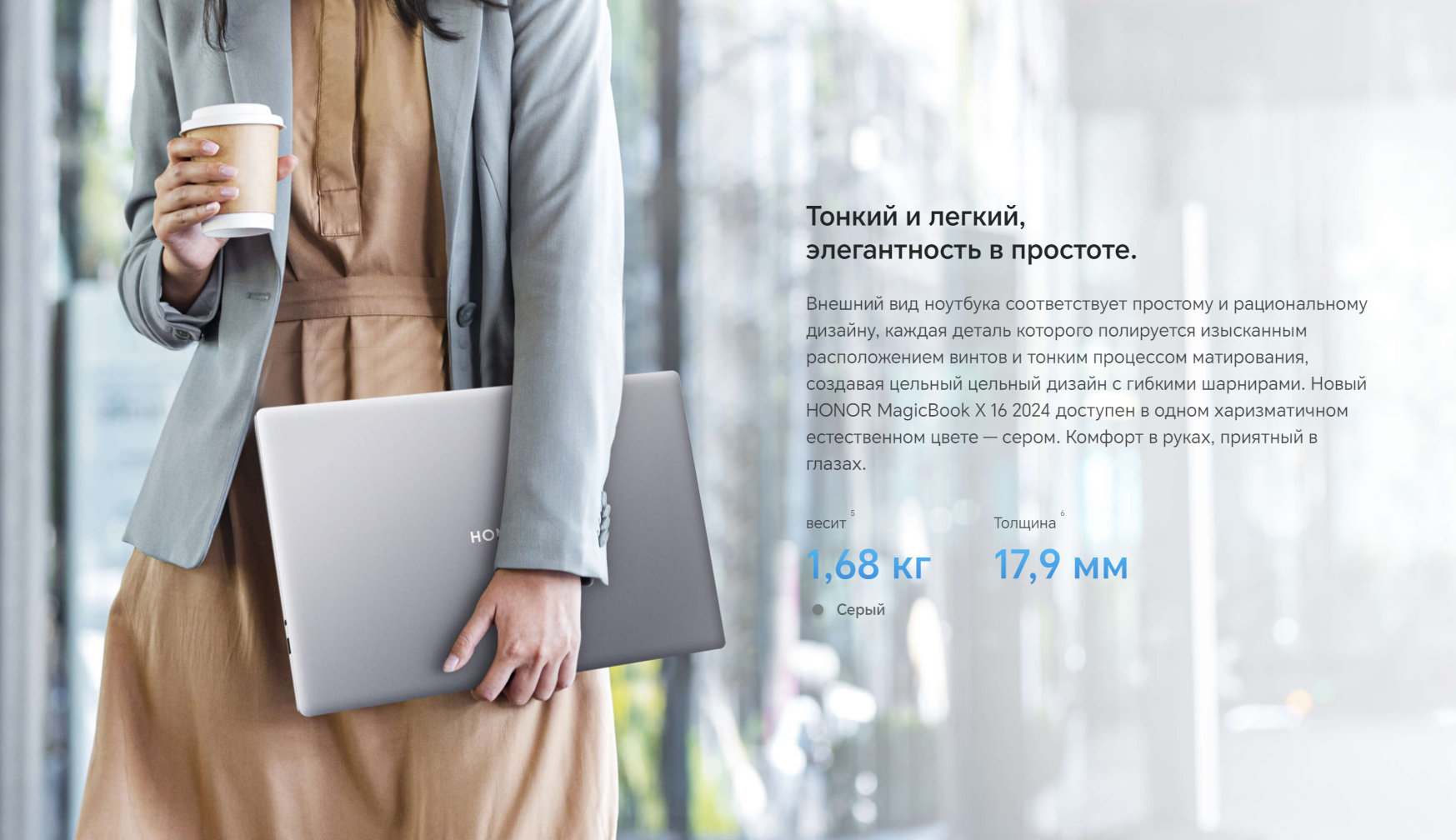 16" Ноутбук Honor MagicBook X16 2024, Intel Core i5 12450H, RAM 16 ГБ, LPDDR4X, SSD 512 ГБ, Windows 11, стальной корпус