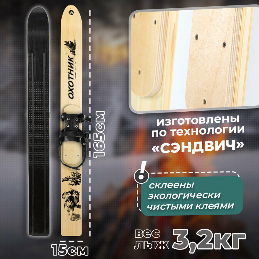 Комплект охотничьих лыж Маяк охотник с креплением брезент и чехлом 165х15 см, дерево-пластик / Лыжи промысловые