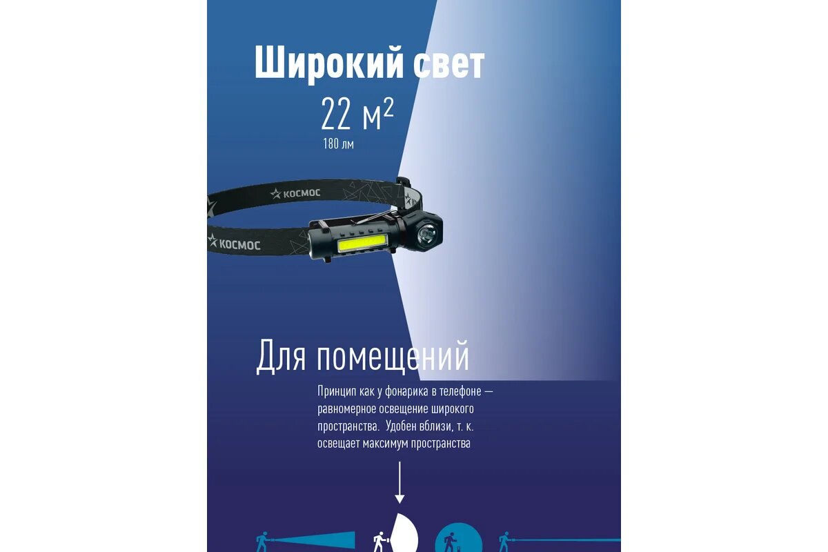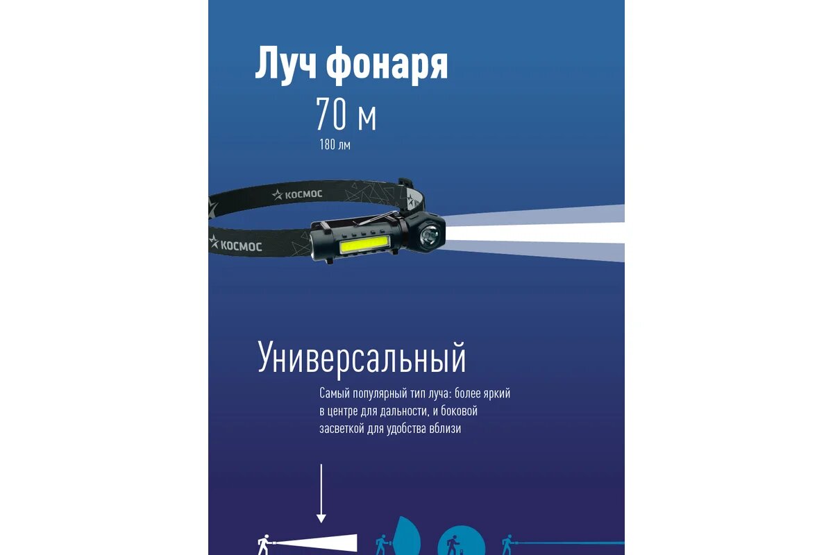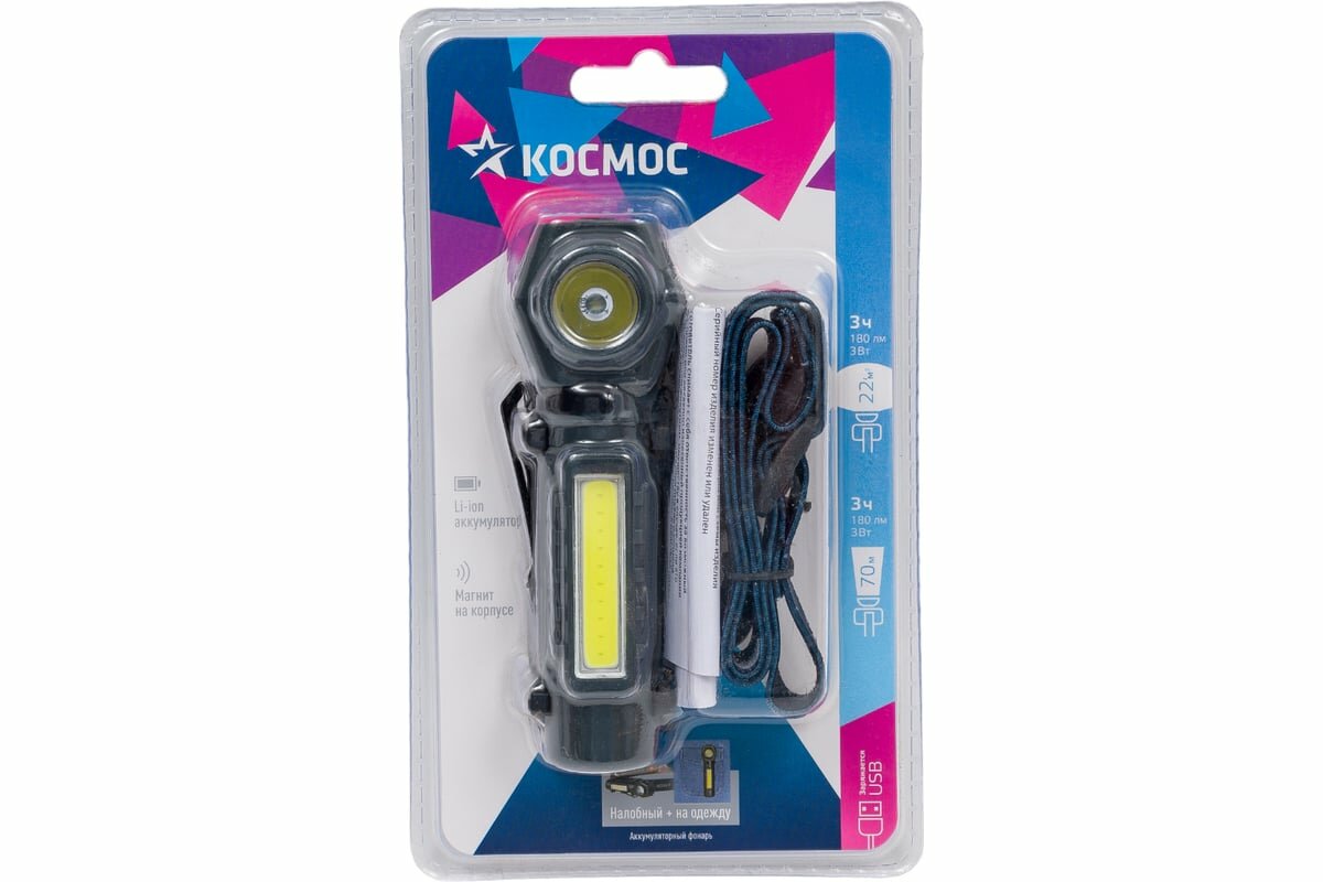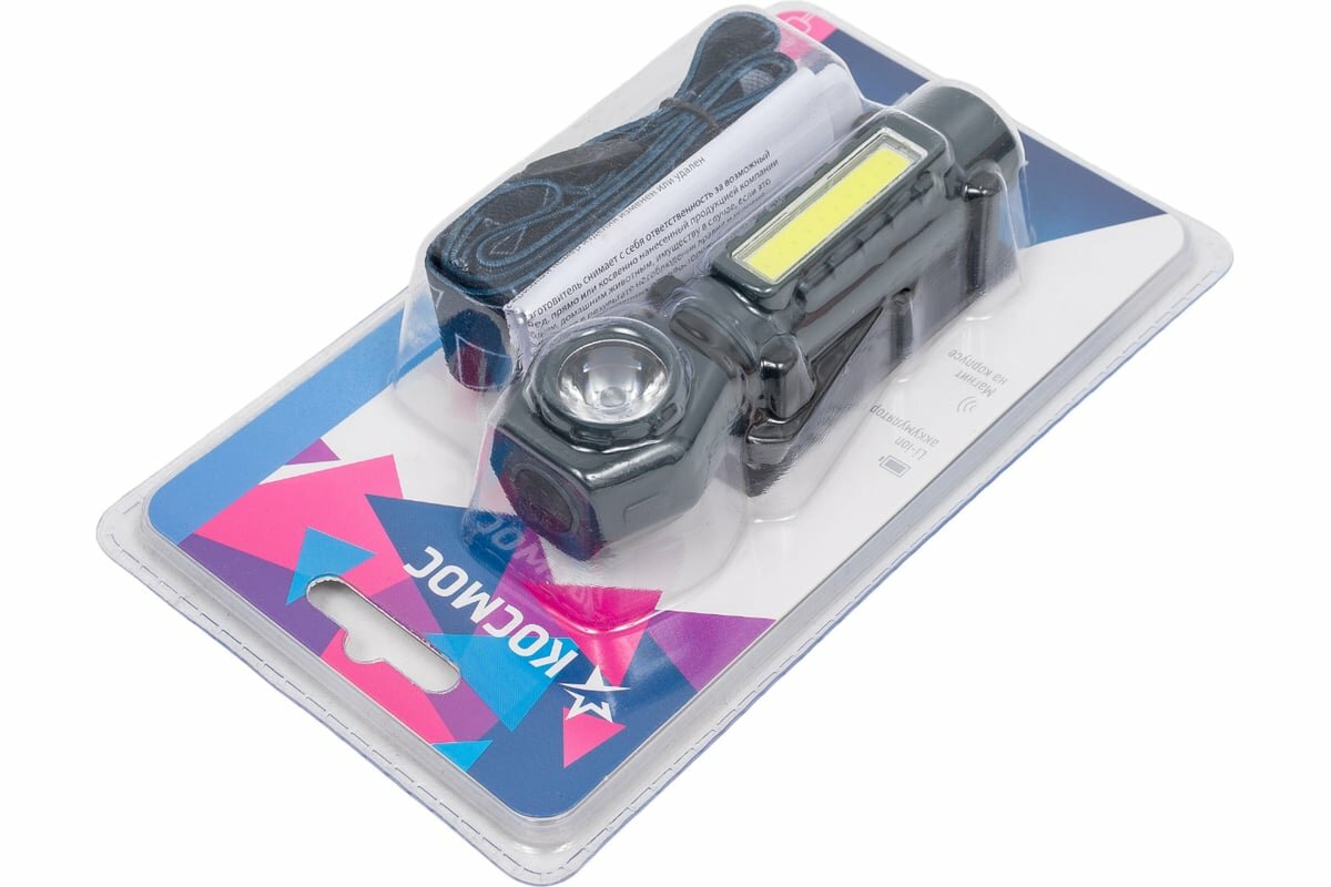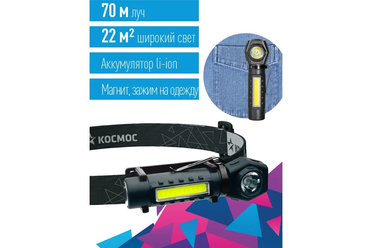 Фонарь налобный аккум/3Вт+3ВтCOB/кол. линза/Li-ion18650 1200mAh/USBtC/магнит/зажим, космос KOC508LIT (1 шт.)