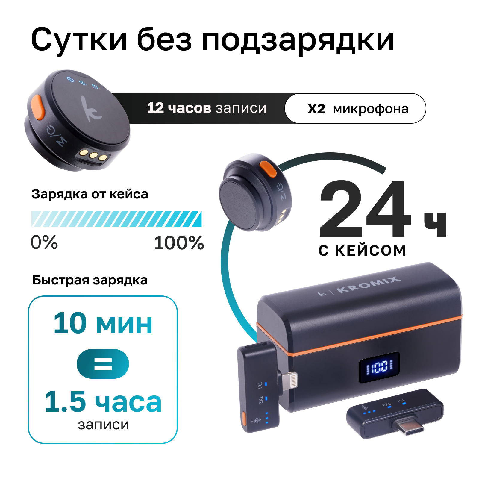 Микрофон петличка Kromix Nova, беспроводной, с зарядным кейсом, Lightning, 2 шт. , черный