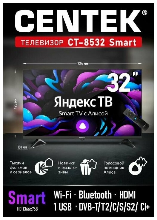 Телевизор CENTEK CT-8732: SMART, 32 дюйма HD, Wi-Fi, Bluetooth, HDMIx2, USBx1, DVB-T/T2, Яндекс YaOS, Алиса
