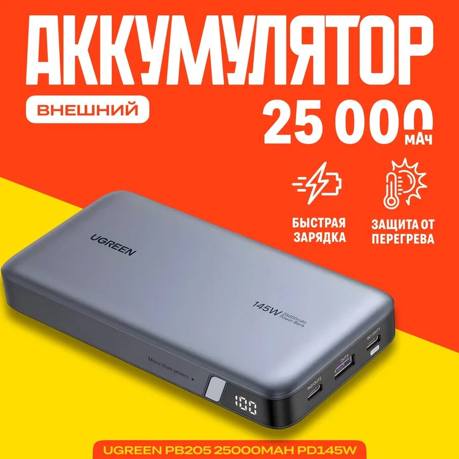 СохранитьВнешний аккумулятор Ugreen PB205 25000mAh PD145W 2хType-C +1хUSB-A (90597A), тёмно-синий/ повербанк интересное: