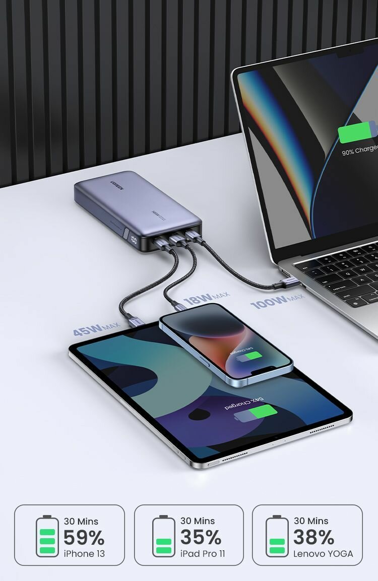 Портативный аккумулятор Ugreen PB205, 25000мАч, 3 выходных разъема, 145Вт