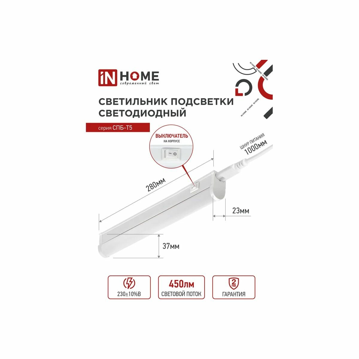 Светильник светодиодный IN HOME СПБ-T5, 7 Вт, 230 В, 4000 К, 630 Лм, IP40, 600 мм