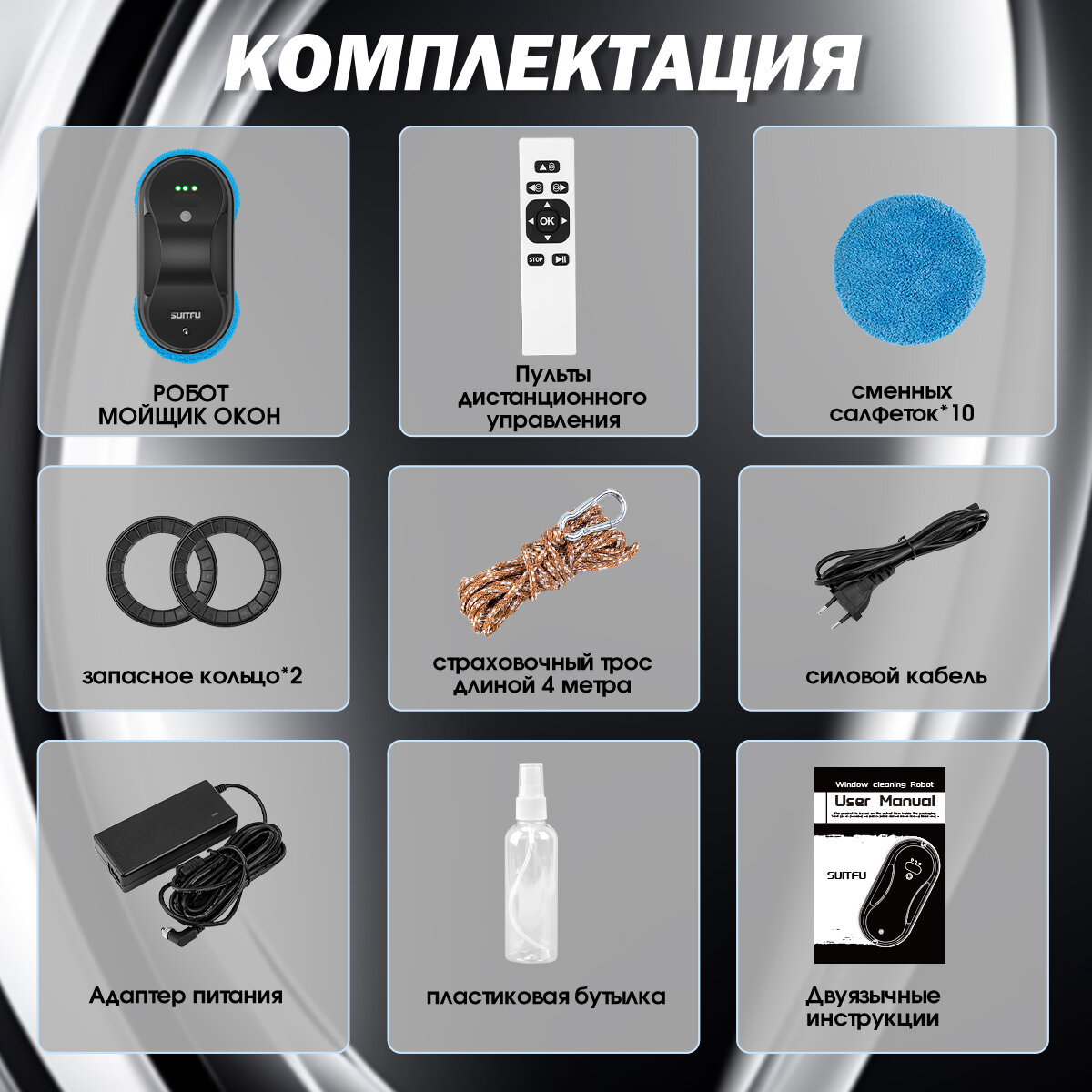 Робот-мойщик окон Suitfu HCR-07 робот для мойки окон, черный+синий Электрические стеклоочистители интересное: