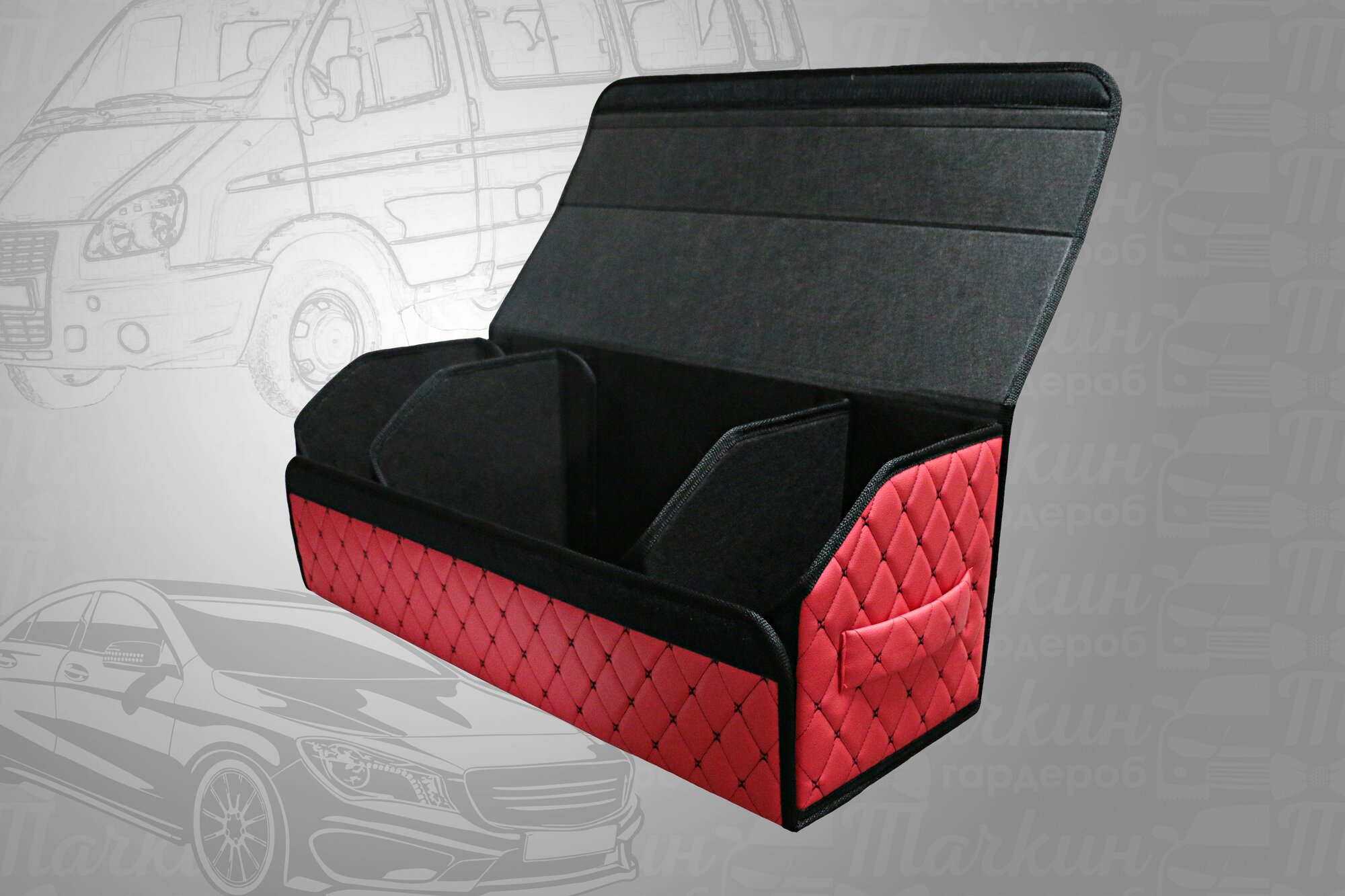 Аксессуары для авто/Органайзер в багажник 80х30х30 рисунок квадрат красный/строчка красная/черная окантовка/саквояж/бокс/кофр для авто