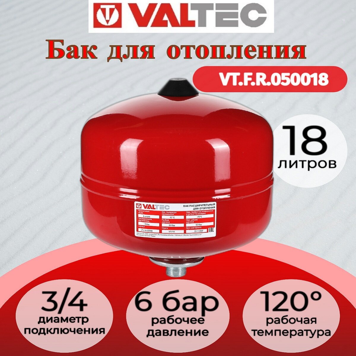 Бак мембранный для систем отопления VALTEC 18л./1,5 - 6bar (3/4") VT.F.R.050018