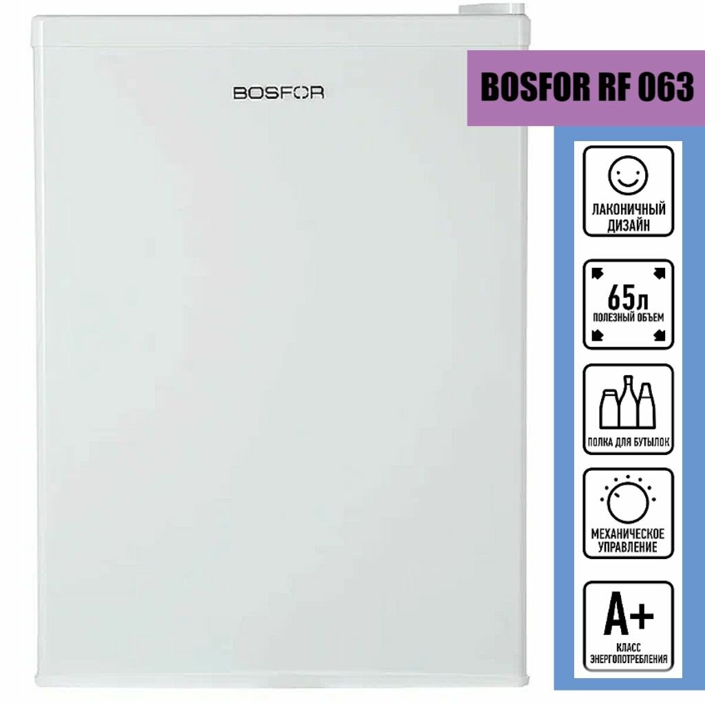 Купить Холодильник мини mini однокамерный Bosfor RF 063. Хладагент: R600a. Общий объем: 67 л. Общий полезный объем: 65 л. Белый. Расположение морозильной камеры: сверху (OL).