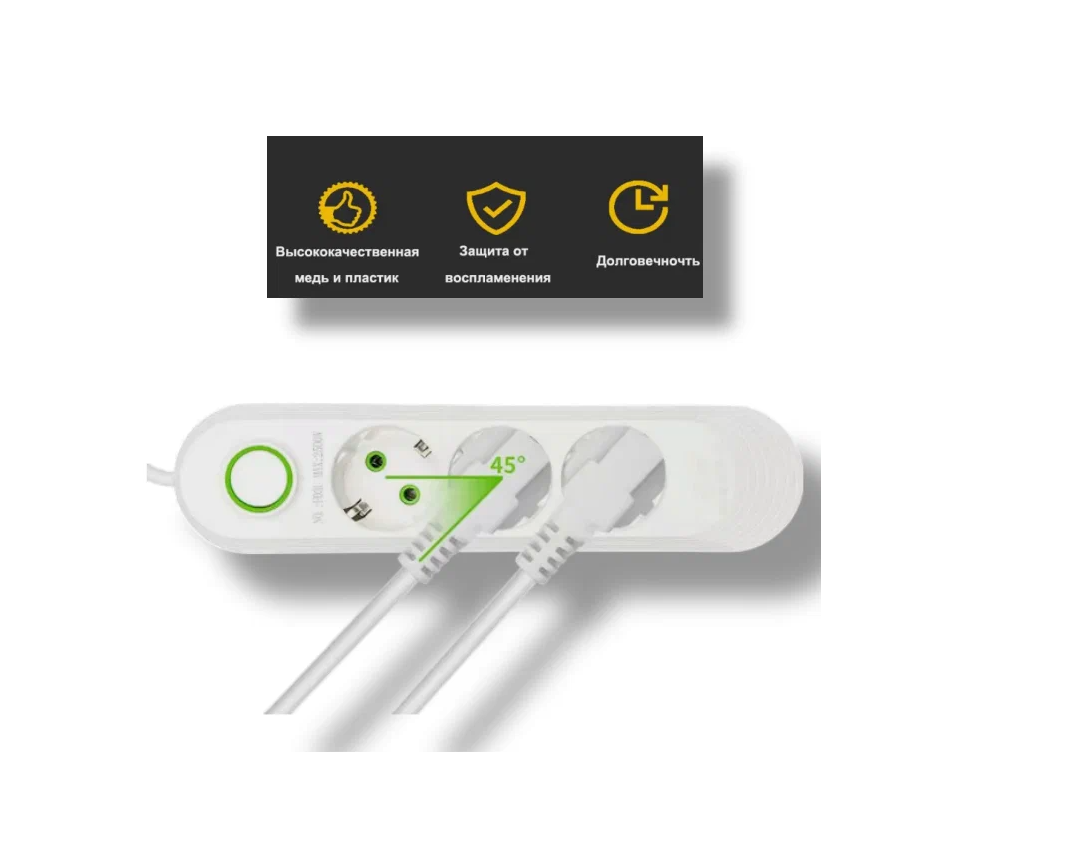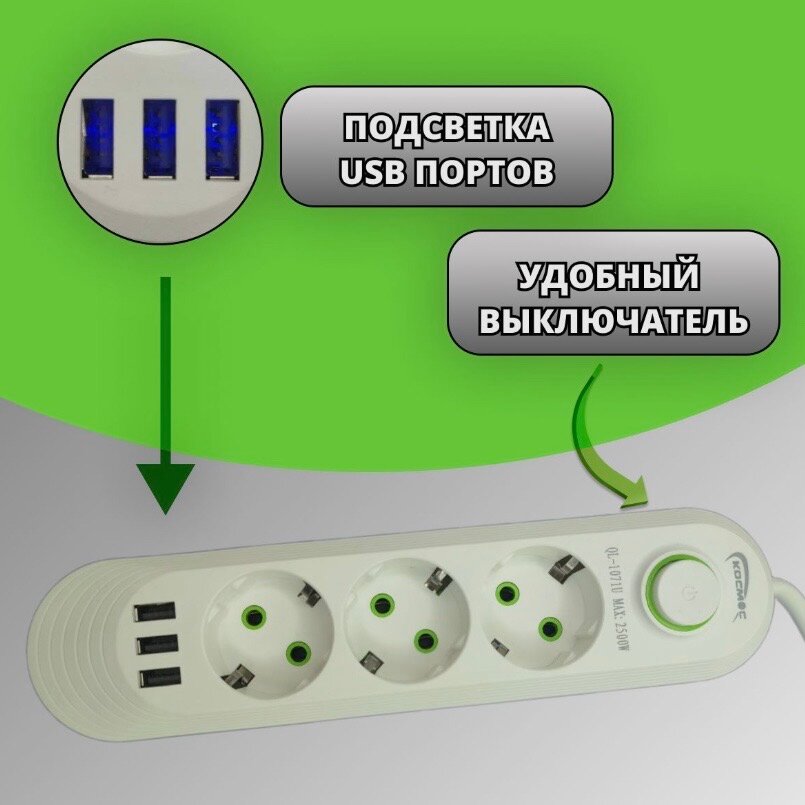 Сетевой фильтр удлинитель 3 розетки, 3 USB, 3 метра, выключатель, белый интересное: