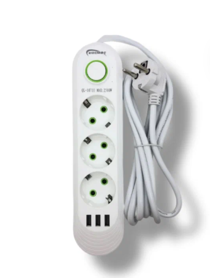 Купить Сетевой фильтр удлинитель 3 розетки, 3 USB, 3 метра, выключатель, белый