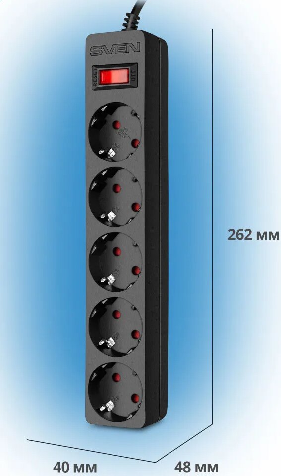 Sven SF-05E 5,0 м (5 розеток с защитными шторками) черный, 2300 Вт, SV-021573