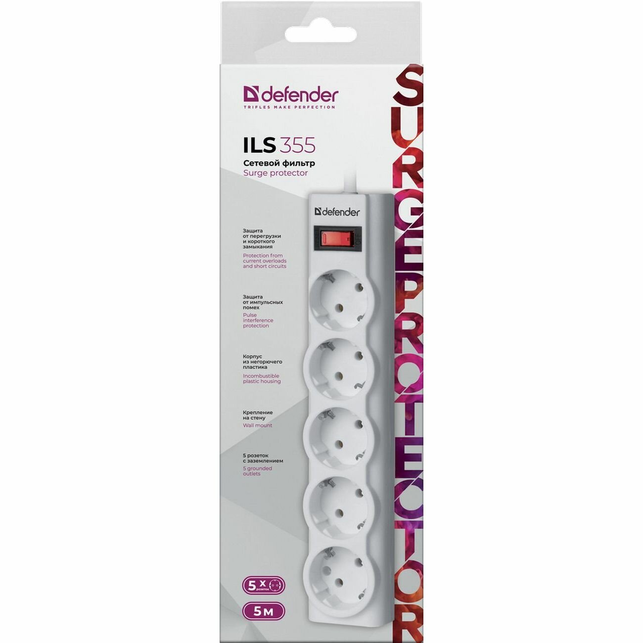 Defender Сетевой фильтр на 5 розеток Defender ILS 355 99355, белый (5.0м) (ret)