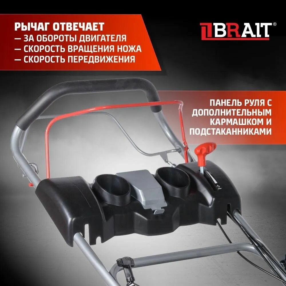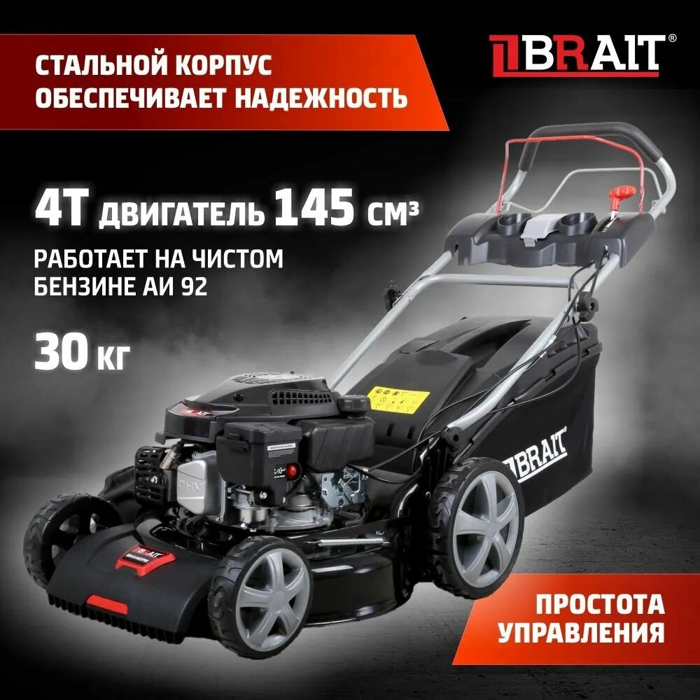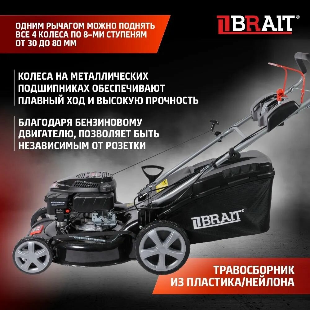 Газонокосилка бензиновая BRAIT BR4546SРМ (4,5 л.с.) самоход, объем 60л, ширина скашивания 460 8 ур. , мульчирование
