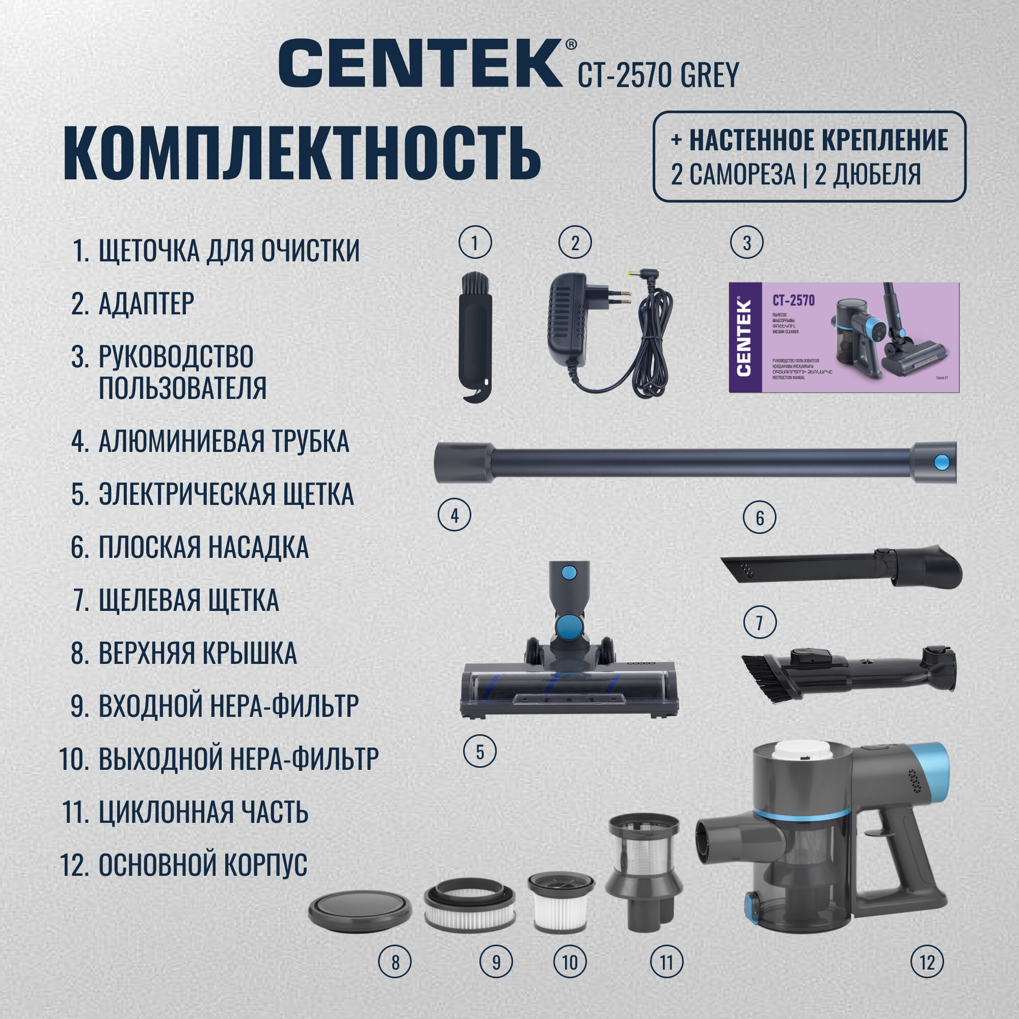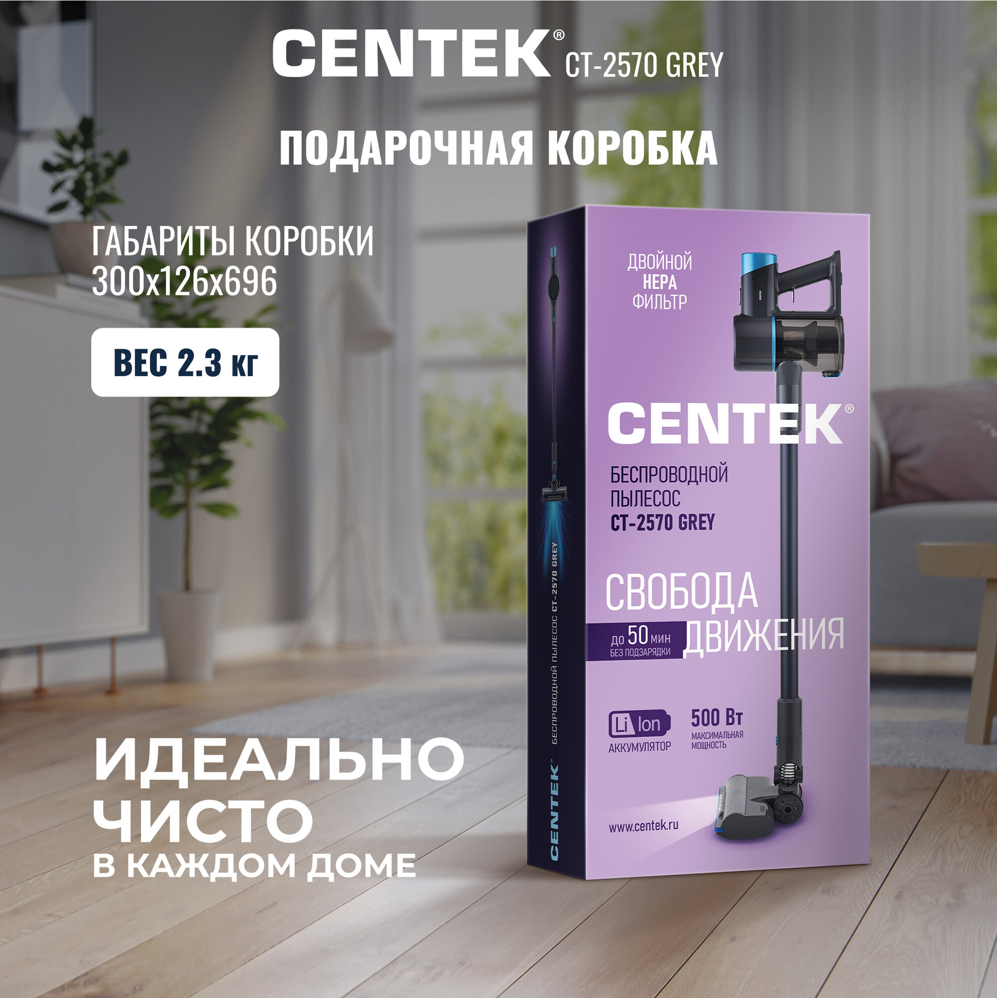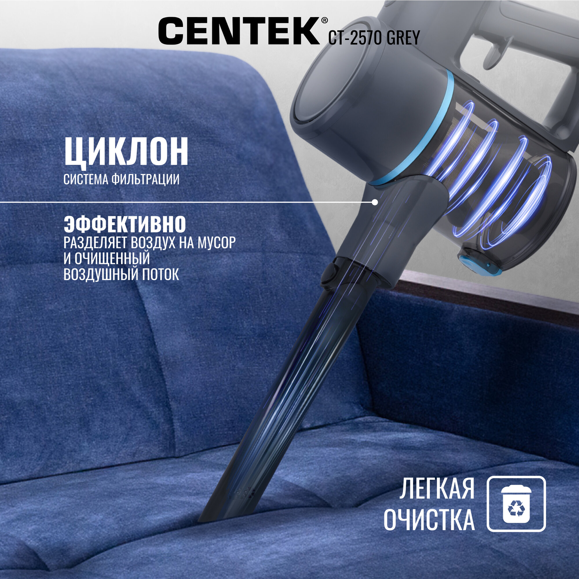 Пылесос вертикальный Centek CT-2570 GREY/3 режима/500Вт/HEPA/циклон/0,6л/TURBO-щетка/беспроводной