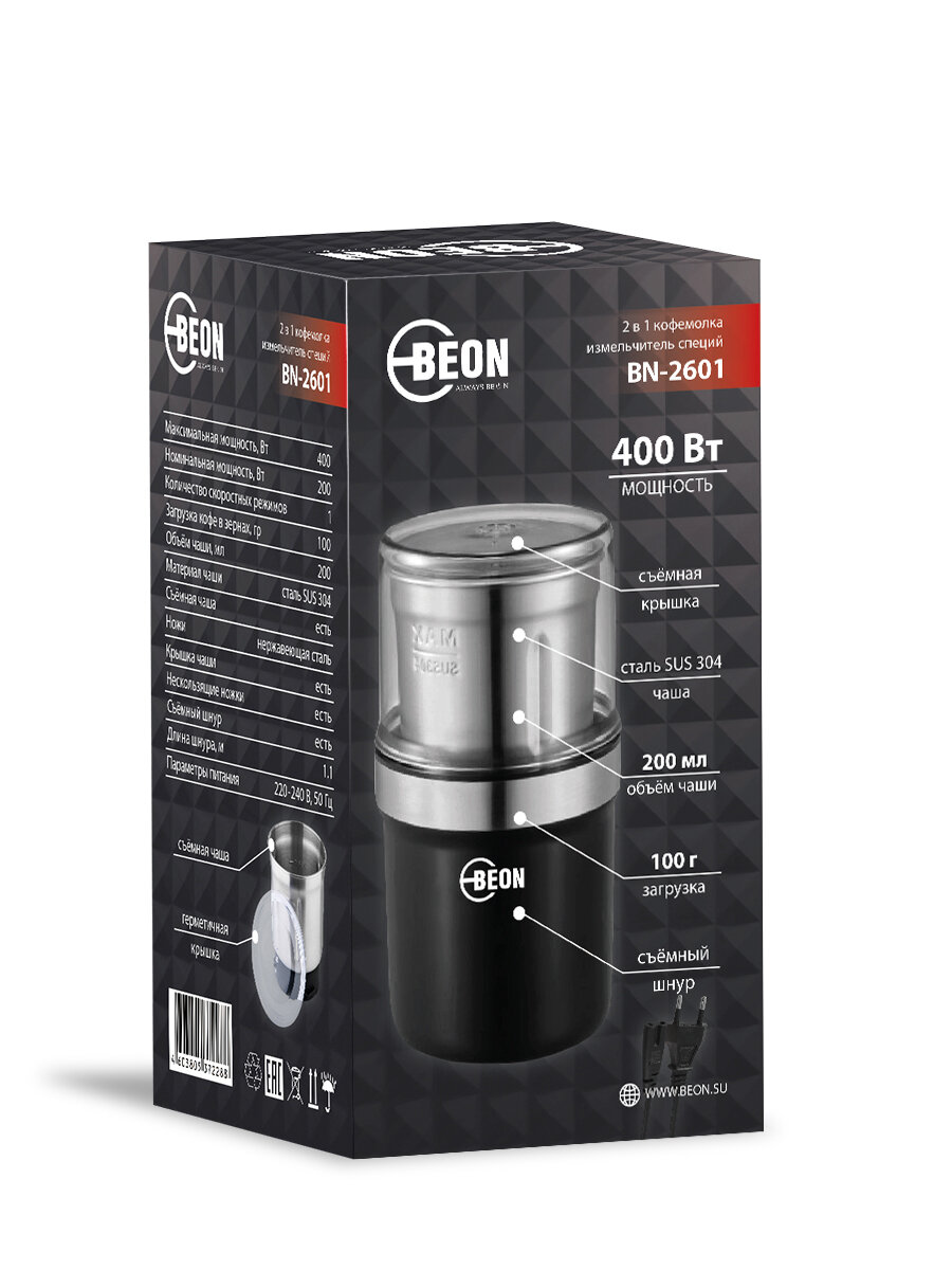 Кофемолка-измельчитель специй 2в1 BEON BN-2601 400Вт, съемная чаша 200 мл