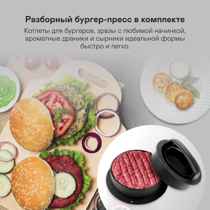 | Насадки | диск для фарша / насадка для кеббе / насадка для приготовления колбас / насадка для шинковки / насадка-терка / соковыжималка |
