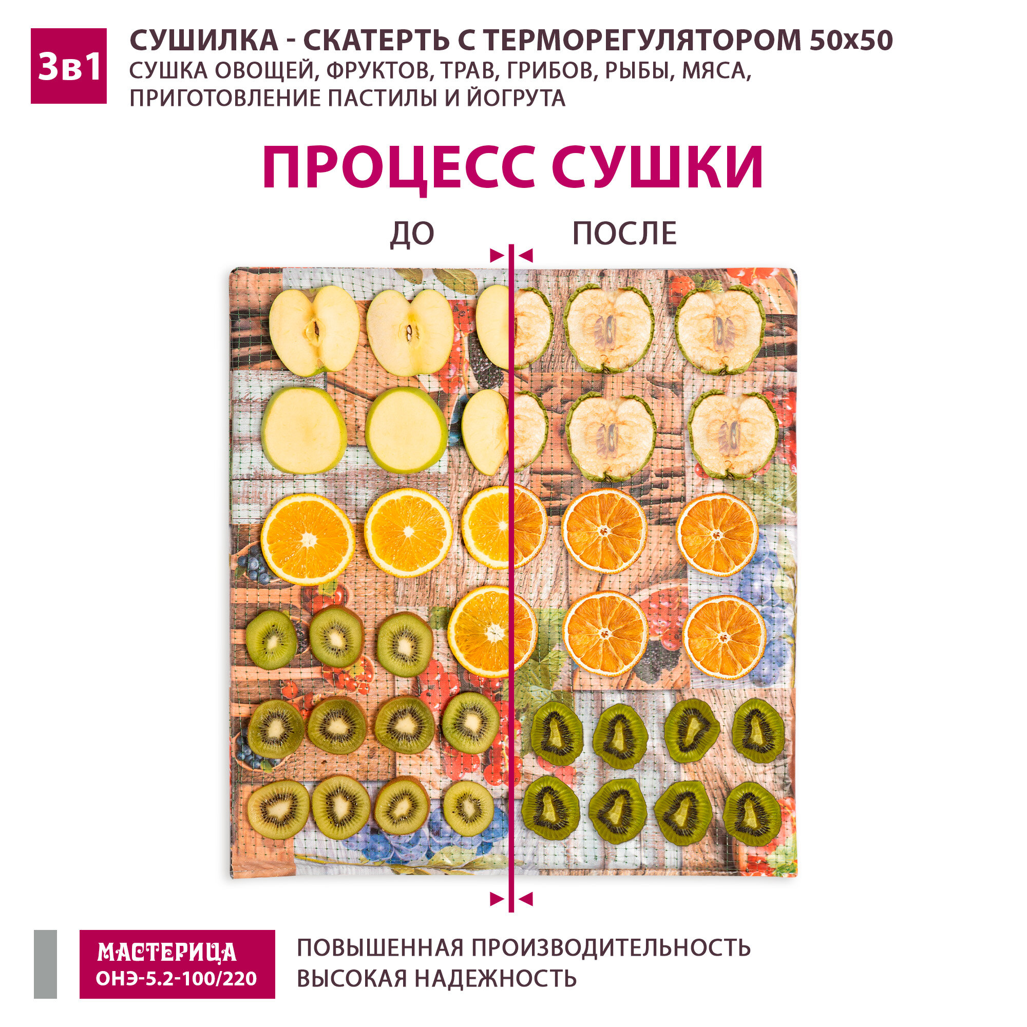 Ниже Вы можете прочитать отзывы на Сушилка - скатерть для овощей и фруктов Мастерица ОНЭ-5.2-100/220 50х50см с терморегулятором, ознакомится с подробными характеристиками, посмотреть интересные обзоры и фотографии на Сушилка - скатерть для овощей и фруктов Мастерица ОНЭ-5.2-100/220 50х50см с терморегулятором.